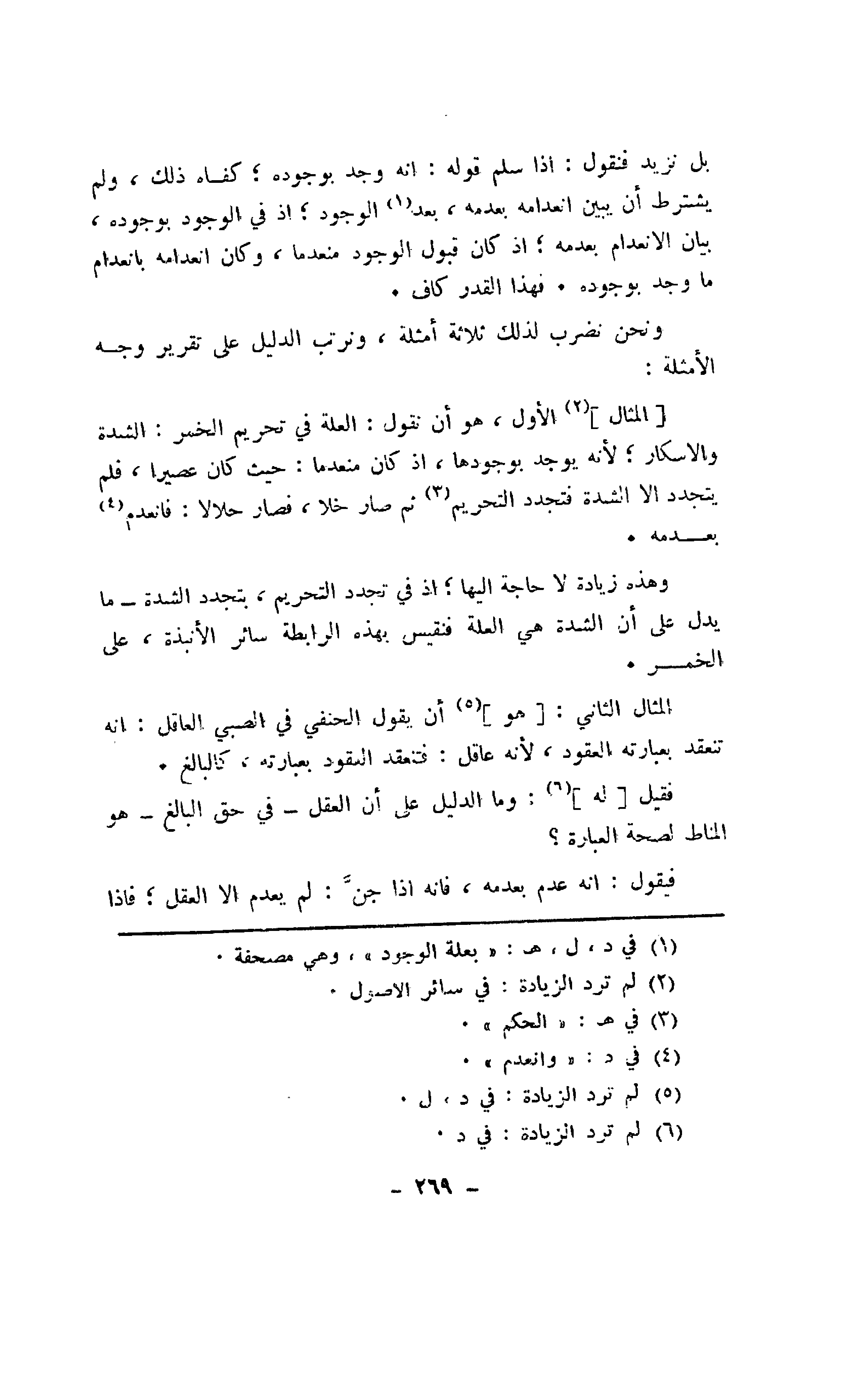 [المثال] الأول، هو أن نقول: العلة في تحريم الخمر: الشدة والإسكار؛ لأنه يوجد بوجودها، إذ كان منعدما: حيث كان عصيرا، فلم يتجدد إلا الشدة فتجدد التحريم ثم صار خلا، فصار حلالا: فانعدم بعدمه.