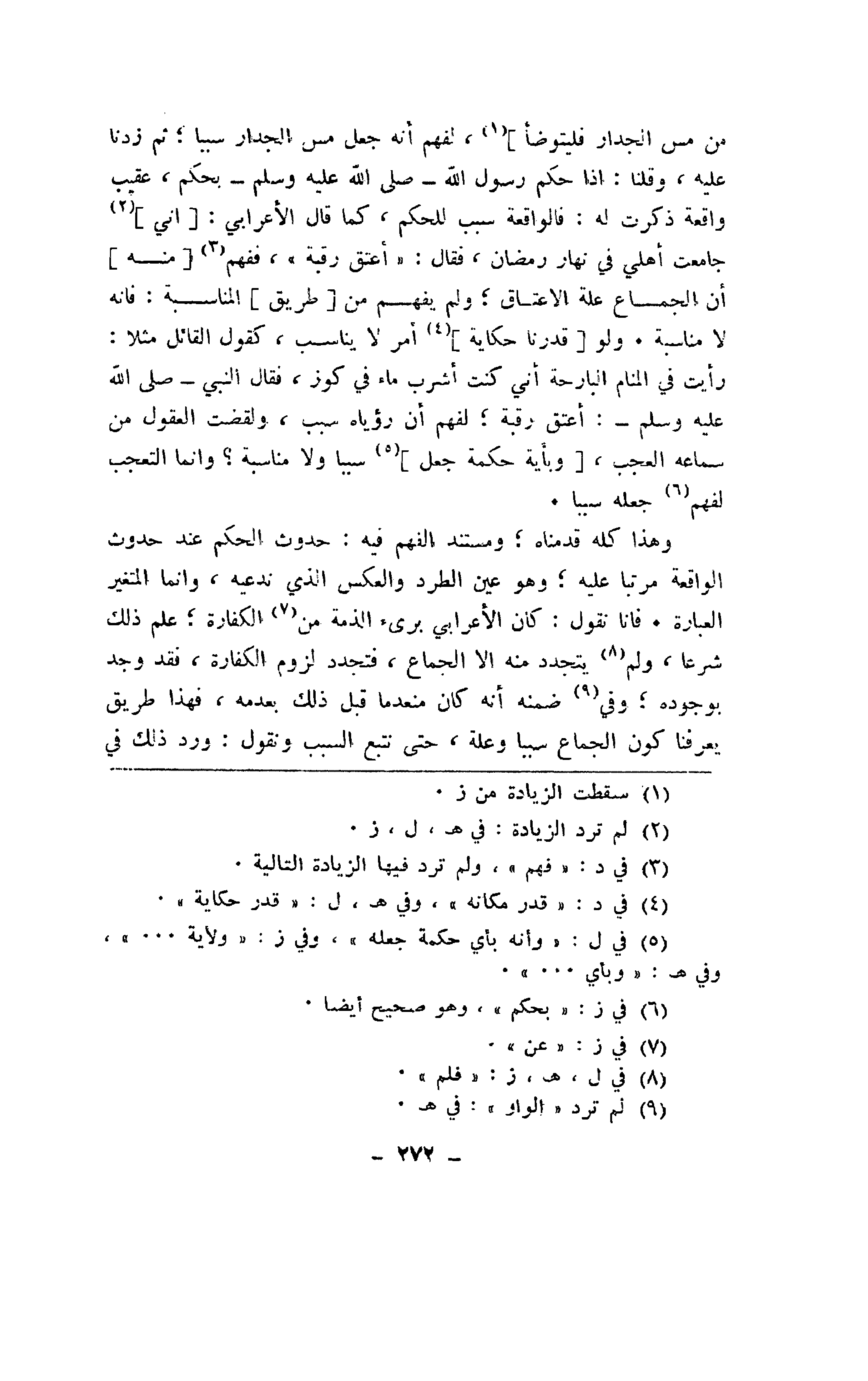 من مس الجدار فليتوضأ]، لفهم أنه جعل مس الجدار سببا؛ ثم زدنا عليه، وقلنا: إذا حكم رسول الله- صلى الله عليه وسلم- بحكم، عقب واقعة ذكرت له: فالواقعة سبب للحكم، كما قال الأعرابي: [إني] جامعت أهلي نهار رمضان، فقال: (أعتق رقبة)، ففهم [منه] أن الجماع علة الإعتاق؛ ولم يفهم من [طريق] المناسبة: فإنه لا مناسبة. ولو [قدرنا حكاية] أمر لا يناسب، كقول القائل مثلا: رأيت في المنام البارحة أني كنت أشرب ماء في كوز، فقال النبي- صلى الله عليه وسلم-: أعتق رقبة؛ لفهم أن رؤياه سبب، ولقضت العقول من سماعه العجب، [وبأية حكمة جعل] سببا ولا مناسبة؟ وإنما التعجب لفهم جعله سببا.