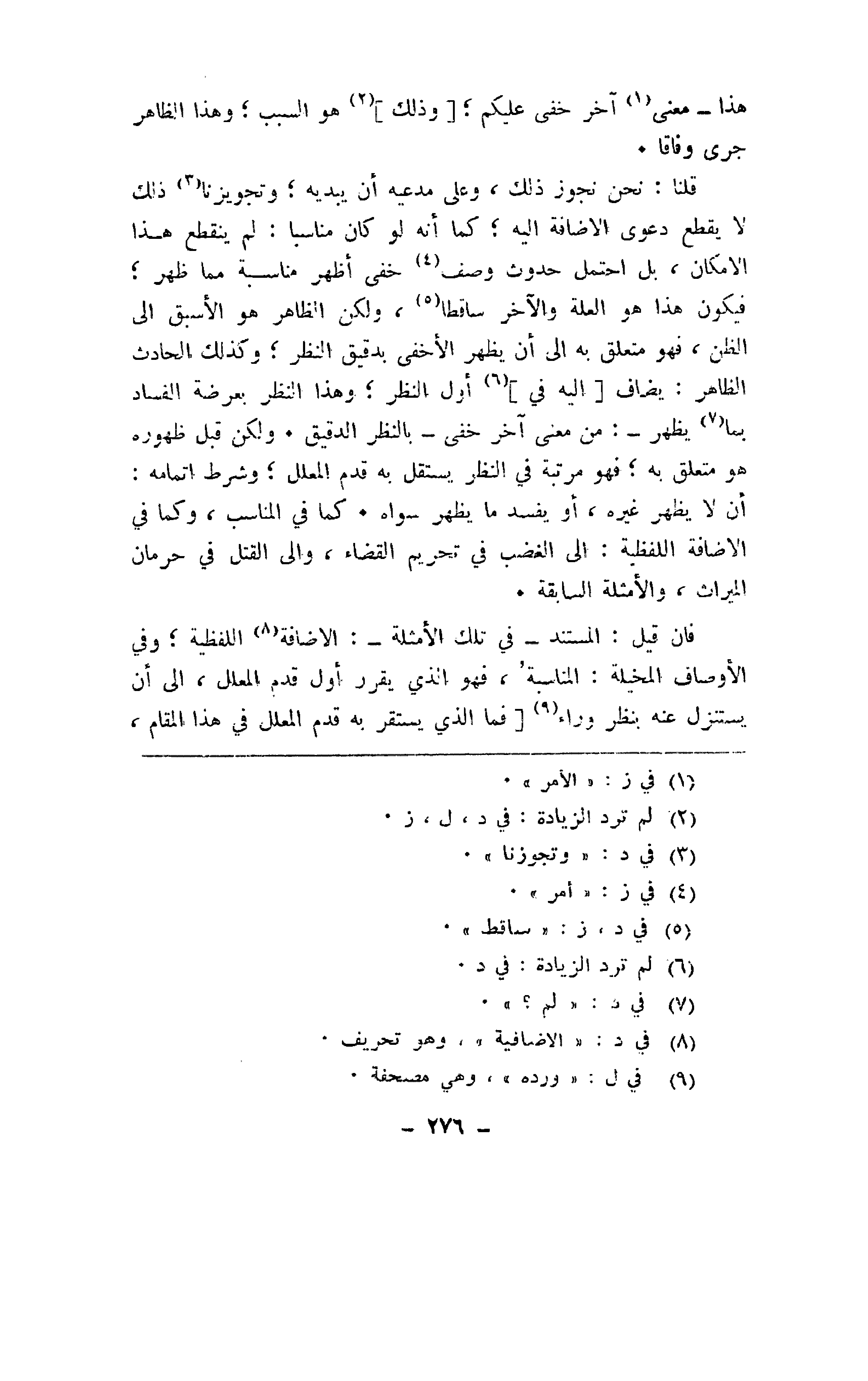 قلنا: نحن نجوز ذلك، وعلى مدعيه أن يبديه؛ وتجويزنا ذلك لا يقطع دعوى الإضافة إليه؛ كما أنه لو كان مناسبا: لم ينقطع هذا الإمكان، بل احتمل حدوث وصف خفى أظهر مناسبة مما ظهر؛ فيكون هذا هو العلة والآخر ساقطا، ولكن الظاهر هو الأسبق إلى الظن، فهو متعلق به إلى أن يظهر الأخفى بدقيق النظر؛ وكذلك الحادث الظاهر: يضاف [إليه في] أول النظر؛ وهذا النظر بعرضة الفساد بما يظهر-: من معنى آخر خفى- بالنظر الدقيق. ولكن قبل ظهوره هو متعلق به؛ فهو مرتبة في النظر يستقل به قدم المعلل؛ وشرط اتمامه: أن لا يظهر غيره، أو يفسد ما يظهر سواه. كما في المناسب، وكما في الإضافة اللفظية: إلى الغضب في تحريم القضاء، وإلى القتل في حرمان الميراث، والأمثلة السابقة.