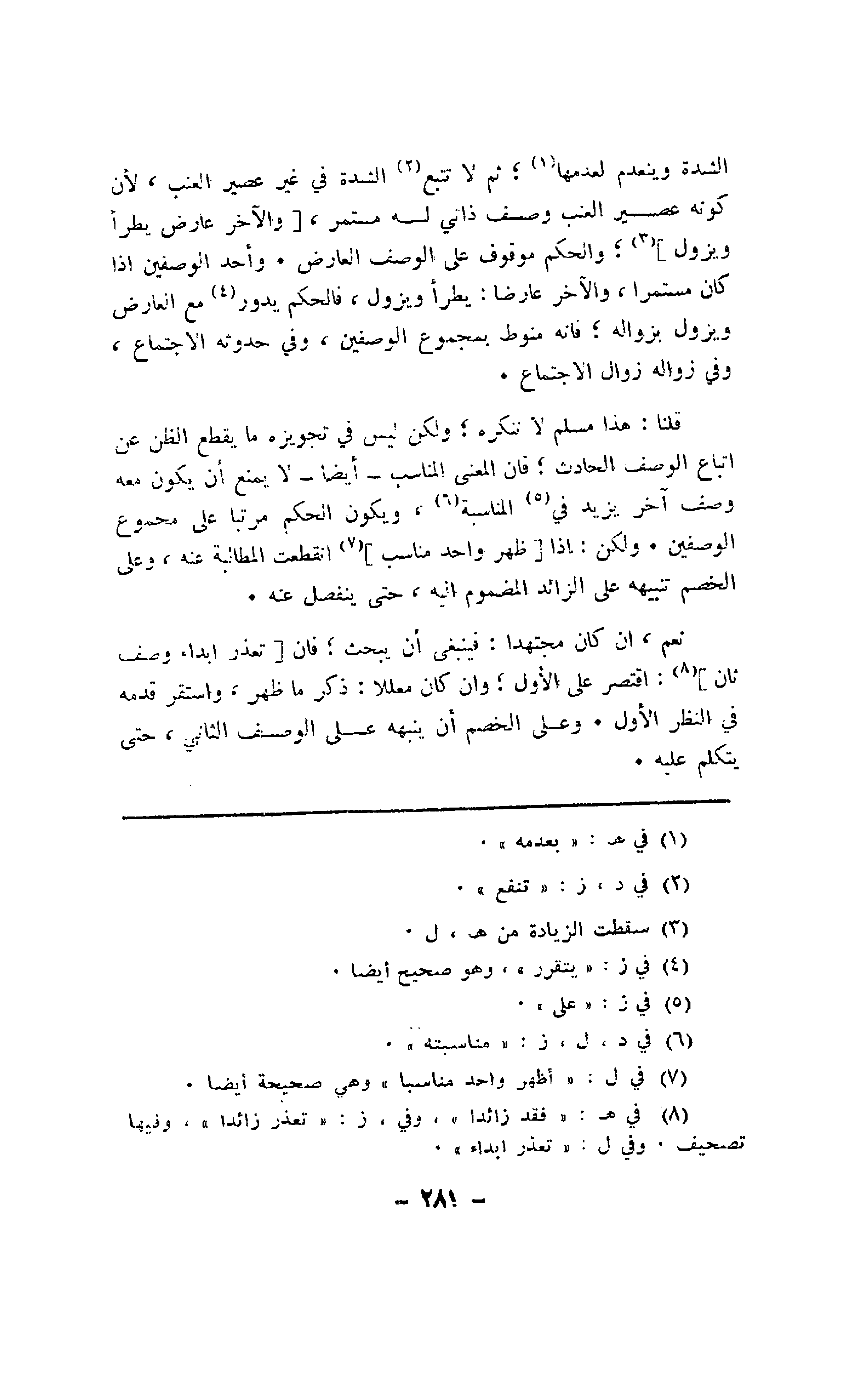 قلنا: هذا مسلم لا ننكره؛ ولكن ليس في تجويزه ما يقطع الظن عن اتباع الوصف الحادث؛ فإن المعنى المناسب- أيضا- لا يمنع أن يكون معه وصف آخر يزيد في المناسبة، ويكون الحكم مرتبا على مجموع الوصفين. ولكن: إذا [ظهر واحد مناسب] انقطعت المطالبة عنه، وعلى الخصم تنبيهه على الزائد المضموم إليه، حتى ينفصل عنه.