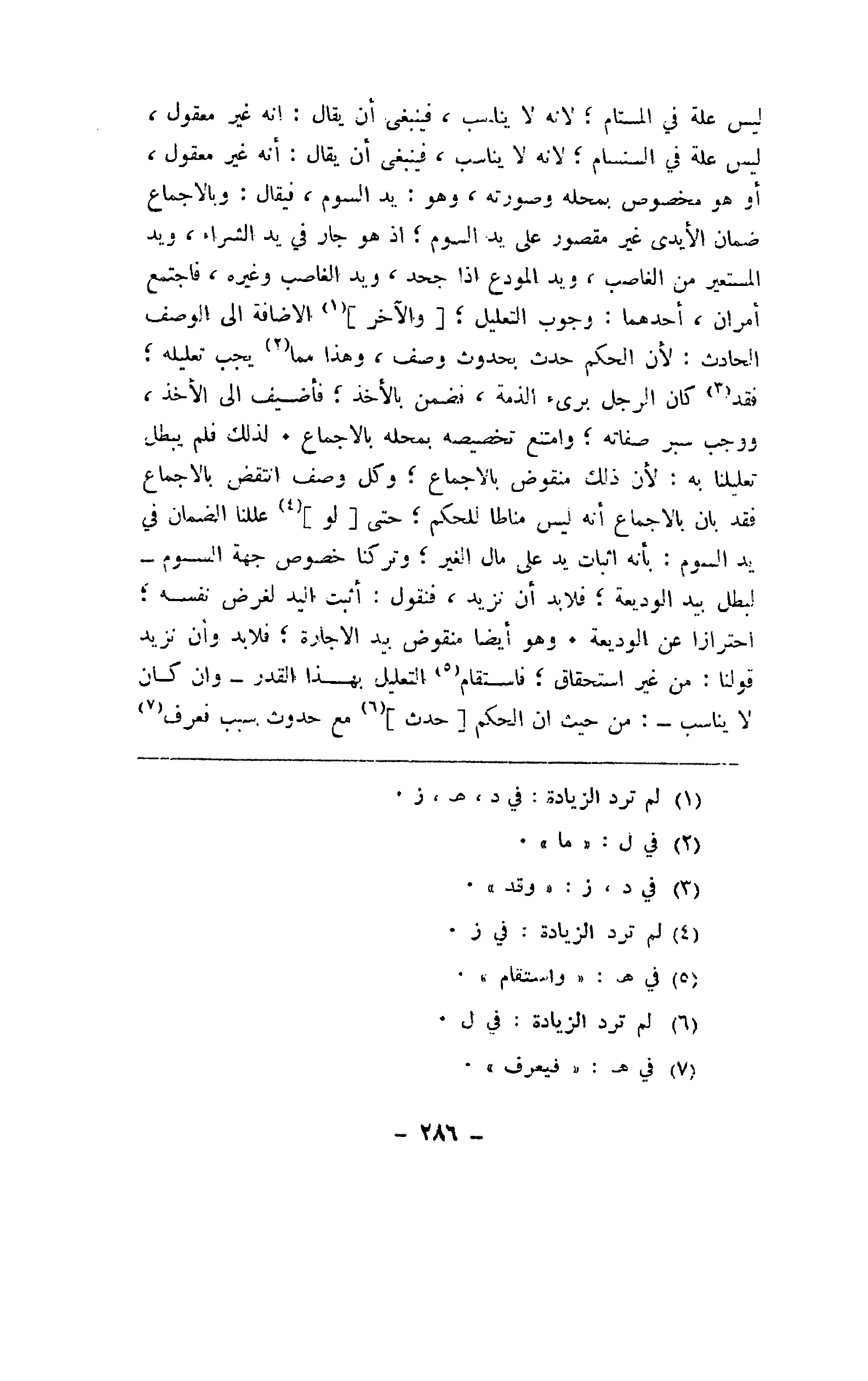 ليس علة في المستام؛ لأنه لا يناسب، فينبغي أن يقال: أنه غير معقول، ليس علة في السنسام؛ لأنه لا يناسب، فينبغي أن يقال: أنه غير معقول، أو هو مخصوص بمحله وصورته، وهو: يد السوم، فيقال: وبالإجماع ضمان الأيدي غير مقصود على يد السو؛ إذ هو جار في يد الشراء، ويد المستعير من الغاصب، ويد المودع إذا جحد، ويد الغاصب وغيره، فاجتمع أمران، أحدهما: وجوب التعليل؛ [والآخر] الإضافة إلى الوصف الحادث: لأن الحكم حدث بحدوث وصف، وهذا مما يجب تعليله؛ فقد كان الرجل بريء الذمة، تضمن بالأخذ؛ فأضيف إلى الأخذ، ووجب سير صفاته؛ وامتنع تخصيصه بمحله بالإجماع. لذلك فلم يبطل تعليلنا به: لأن ذلك متفوض بالإجماع؛ وكل وصف انتقض بالإجماع فقد بان بالإجماع أنه ليس مناطاً للحكم؛ حتى [لو] عللنا الضمان في يد السوم: بأنه إثبات يد على مال الغير؛ وتركنا خصوص جهة السوم - لبطل بيد الوديعة؛ فلابد أن نزيد، فتقول: أثبت إليه لغرض نفسه؛ احترازاً عن الوديعة. وهو أيضاً منقوض بيد الإجارة، فلابد وأن نزيد قولنا: من غير استحقاق؛ فاستقام التعليل بهذا القدر - وإن كان لا يناسب -: من حيث أن الحكم [حدث] مع حدوث سبب فعرف