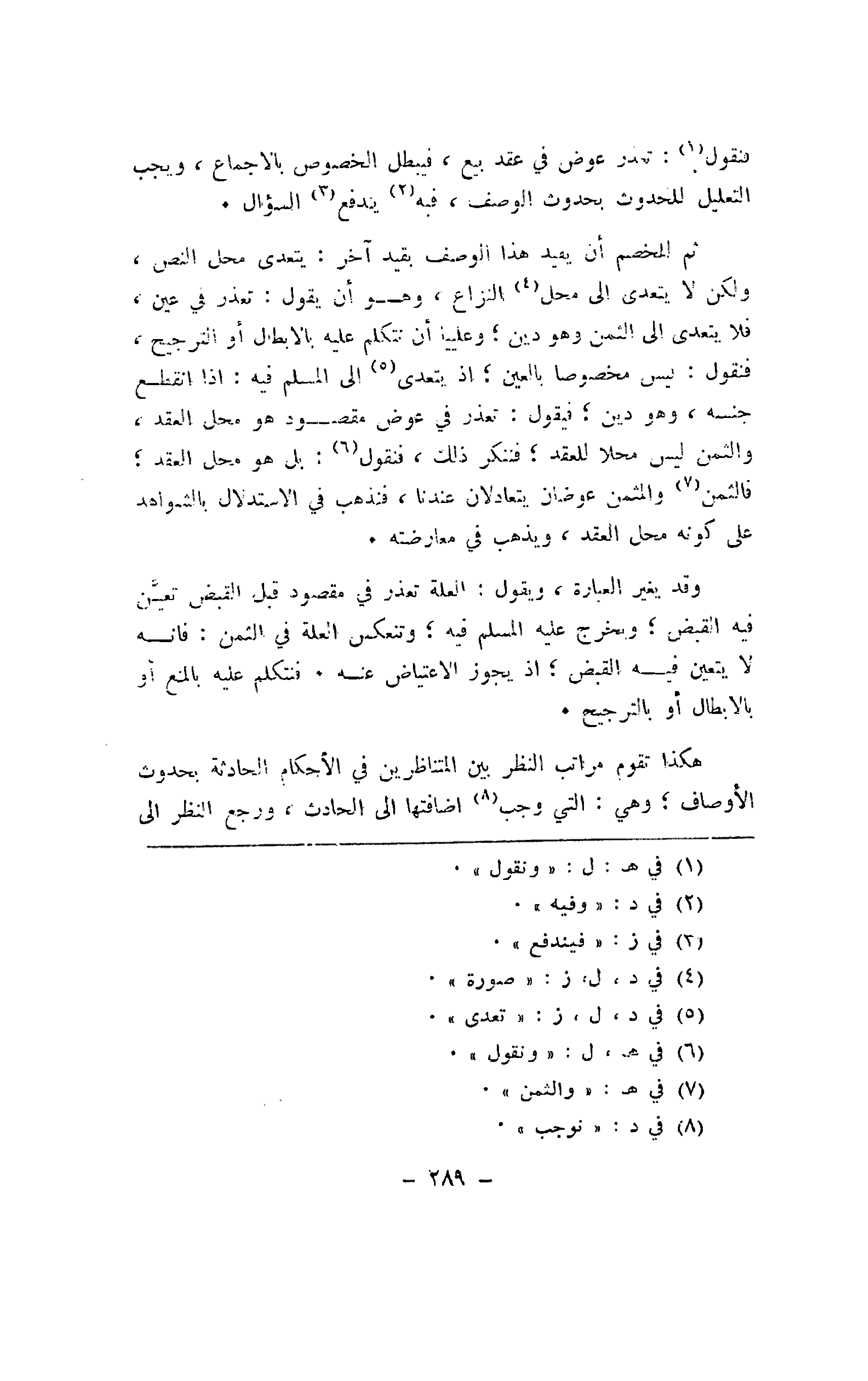 ثم الخصم أن يقيد هذا الوصف بقيد آخر: يتعدى محل النص، ولكن لا يتعدى إلى محل النزاع، وهو أن يقول: تعذر في عين، فلا يتعدى إلى الثمن وهو دين؛ وعلينا أن نتكلم عليه بالإبطال أو الترجيح، فنقول: ليس مخصوصاً بالعين؛ إذ يتعدى إلى المسلم فيه: إذا انقطع جنسه، وهو دين؛ فيقول: تعذر في عوض مقصود هو محل العقد، والثمن ليس محلاً للعقد؛ فينكر ذلك، فنقول: بل هو محل العقد؛ فالثمن والمثمن عوضان يتعادلان عندنا، فنذهب في الاستدلال بالشواهد على كونه محل العقد، ويذهب في معارضته.