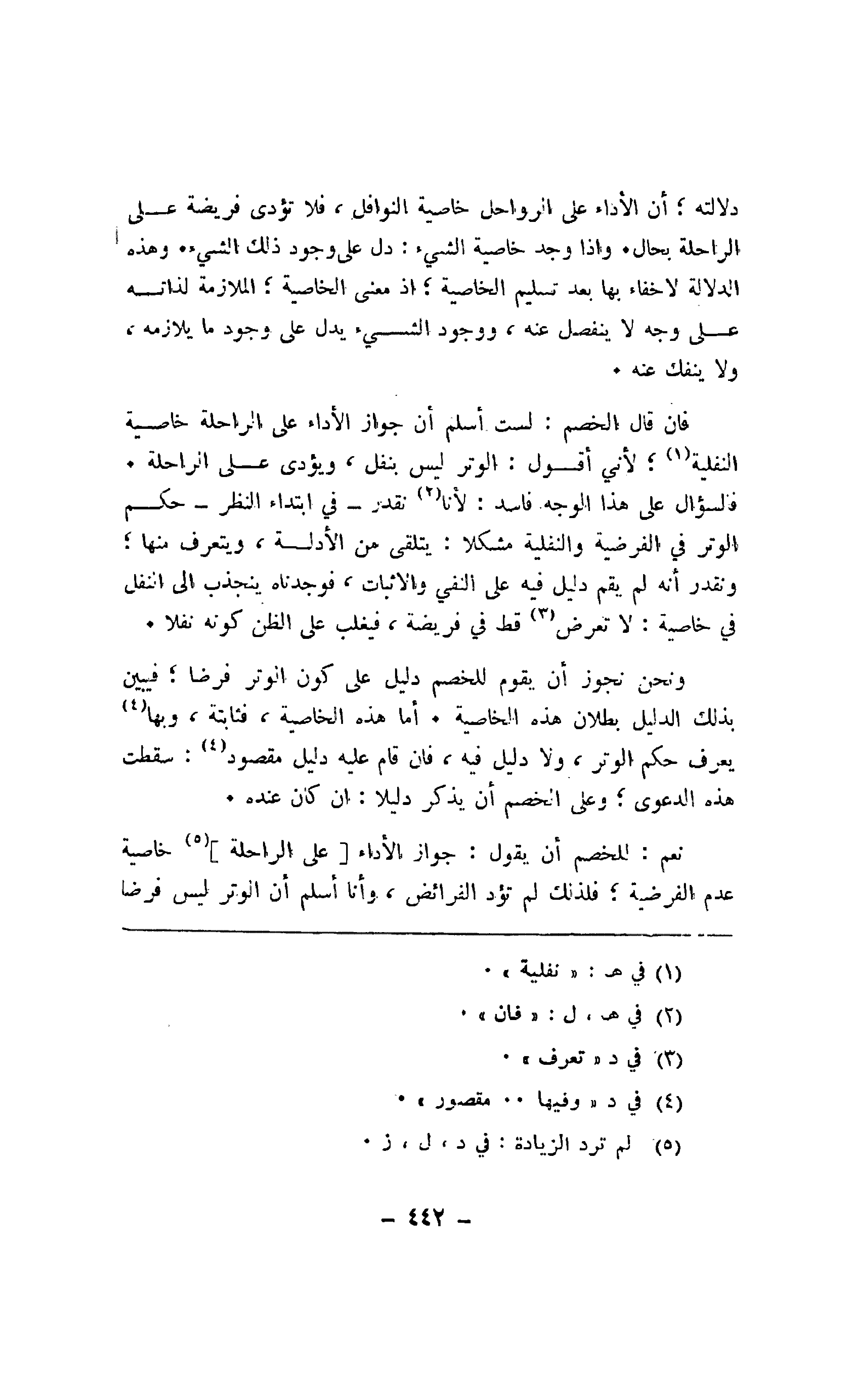 ونحن نجوز أن يقوم للخصم دليل على كون الوتر فرضا؛ فيبين بذلك الدليل بطلان هذه الخاصية. أما هذه الخاصية، فثابتة، وبها يعرف حكم الوتر، ولا دليل فيه، فإن قام عليه دليل مقصود: سقطت هذه الدعوى؛ وعلى الخصم أن يذكر دليلا: إن كان عنده.