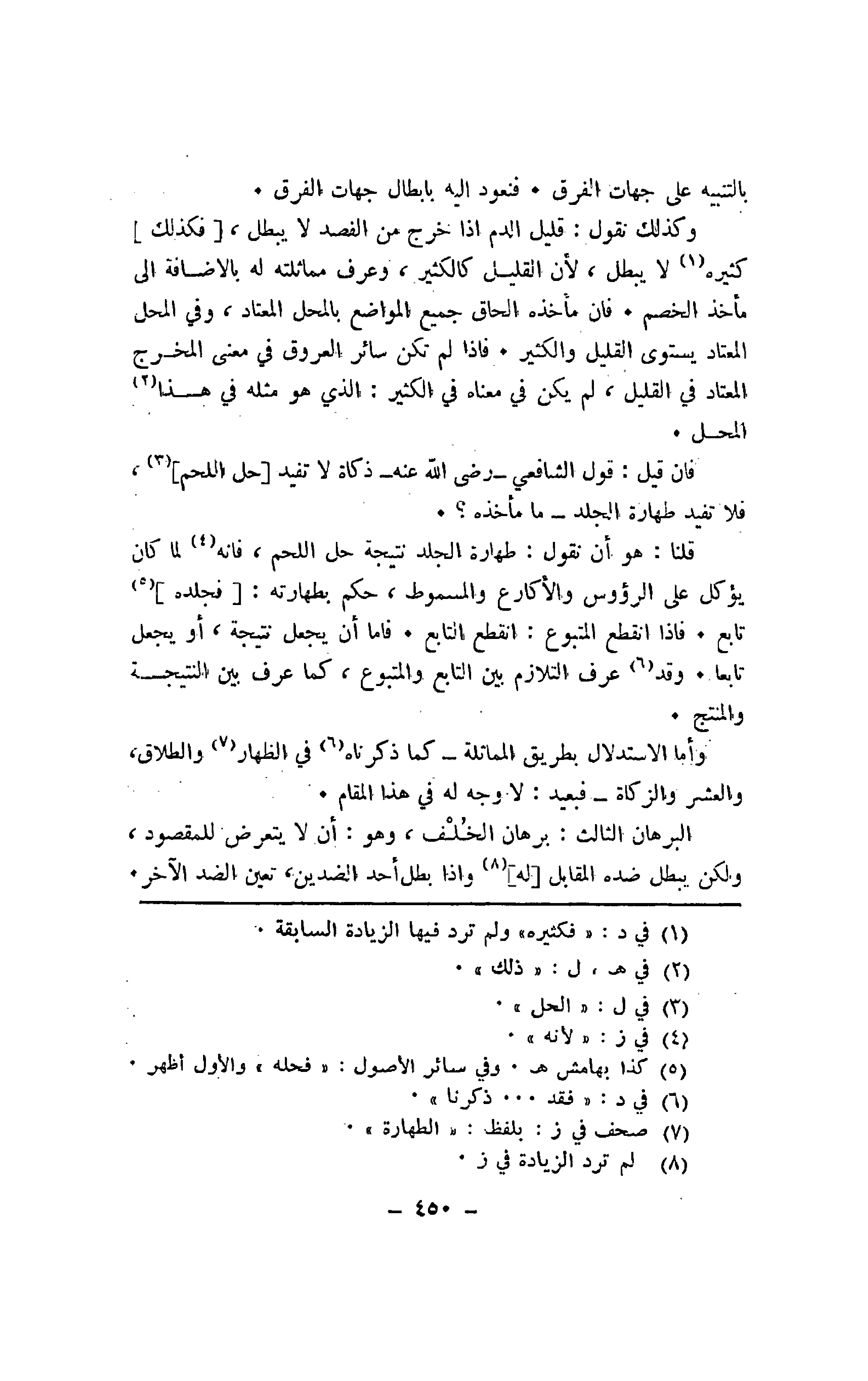 وكذلك نقول: قليل الدم إذا خرج من الفصد لا يبطل، [فكذلك] كثيره لا يبطل، لأن القليل كالكثير، وعرف مماثلته له بالإضافة إلى مأخذ الخصم. فإن مأخذه الحاق جميع المواضع بالمحل المعتاد، وفي المحل المعتاد يستوي القليل والكثير. فإذا لم تكن سائر العروق في معنى المخرج المعتاد في القليل، لم يكن في معناه في الكثير: الذي هو مثله في هذا المحل.