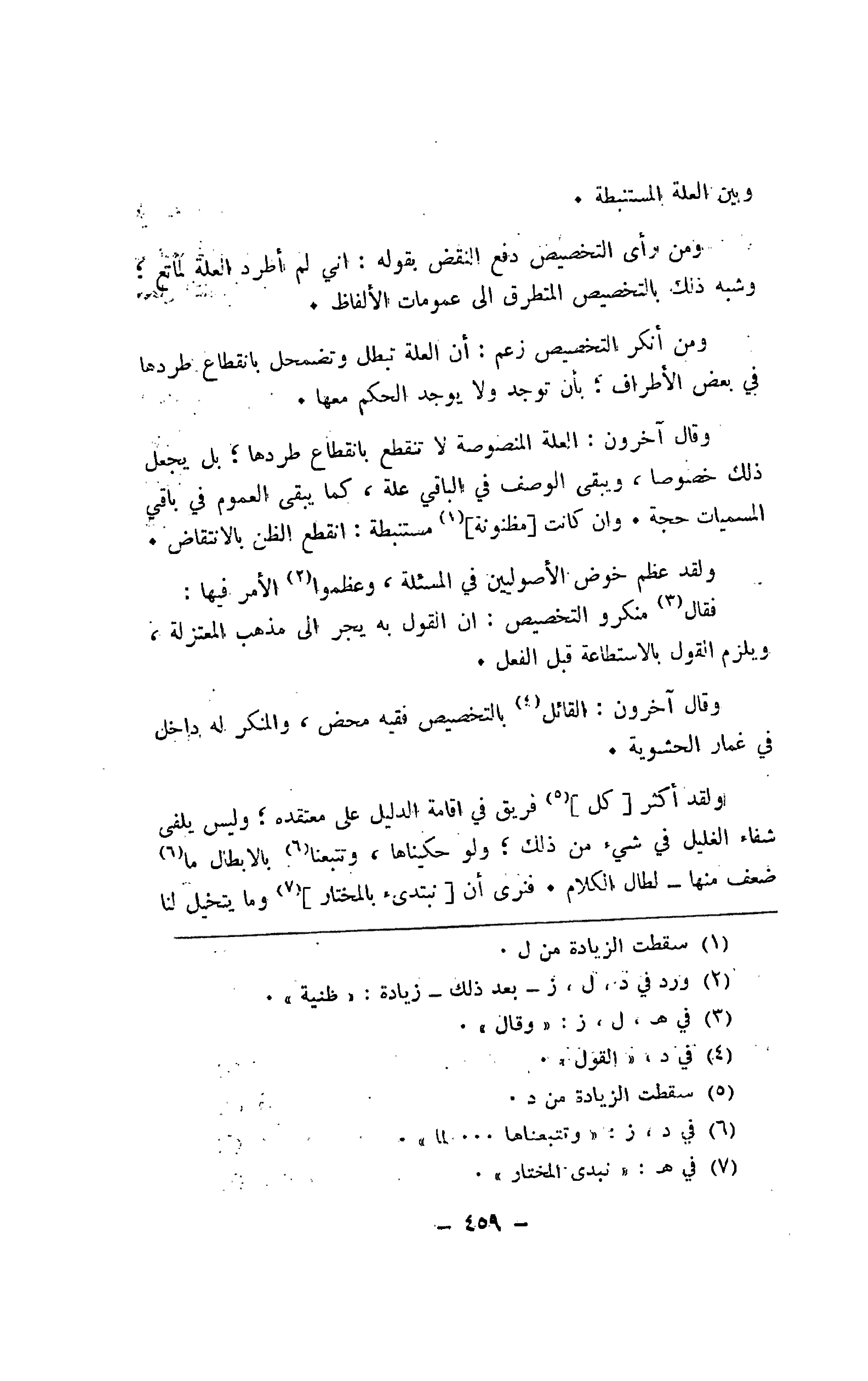 وقال آخرون: المنصوصة لا تنقطع بانقطاع طردها؛ بل يجعل ذلك خصوصا، ويبقى الوصف في الباقي علة، كما يبقى العموم في باقي المسميات حجة. وإن كانت [مظنونة] مستنبطة: انقطع الظن بالانتقاض.