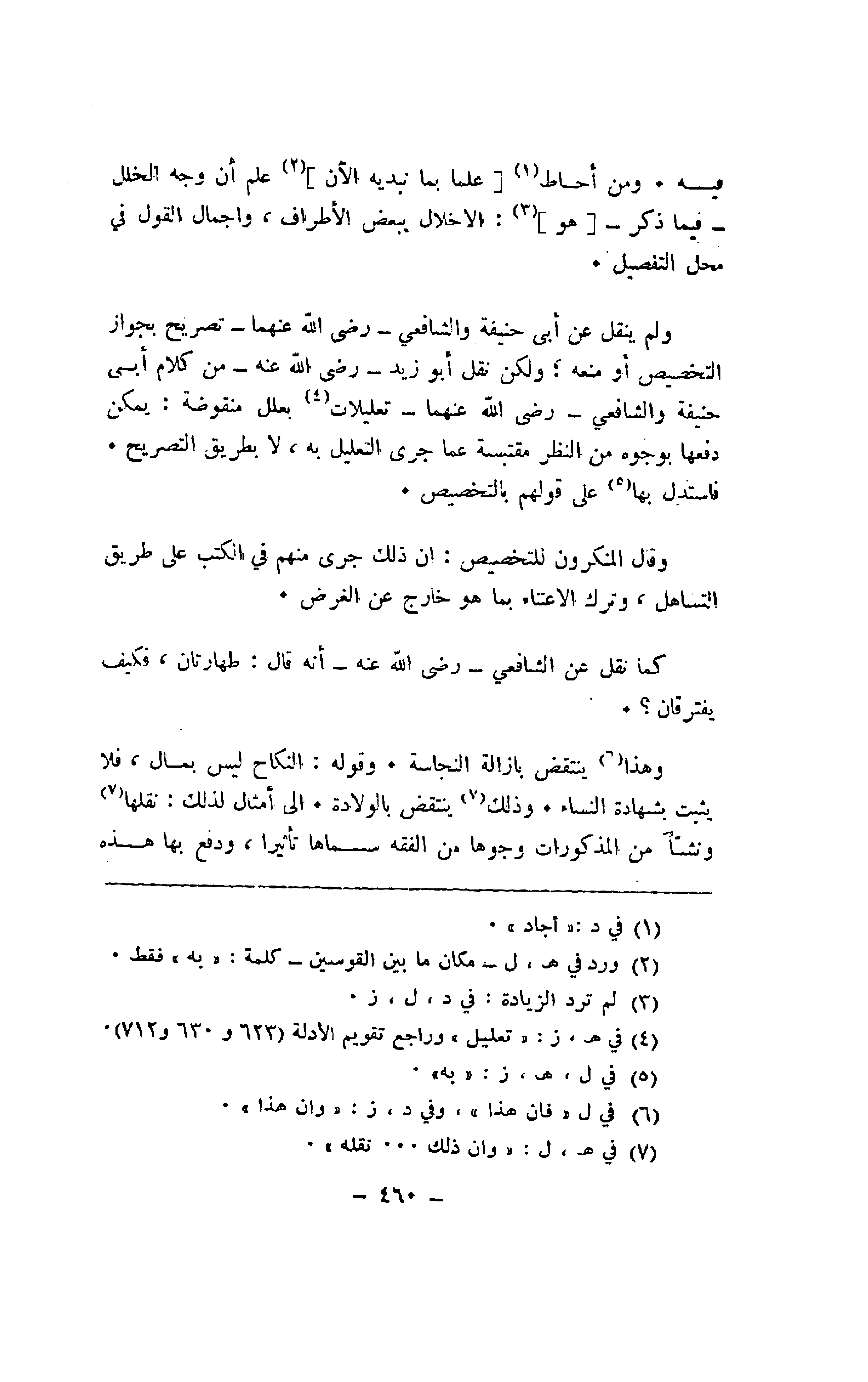 ولم ينقل عن أبي حنيفة والشافعي -رضي الله عنهما -تصريح بجواز التخصيص أو منعه؛ ولكن نقل أبو زيد -رضي الله عنه -من كلام أبي حنيفة والشافعي -رضي الله عنهما -تعليلات بعلل منقوضة: يمكن دفعها بوجوه من النظر مقتبسة عما جرى التعليل به، لا بطريق التصريح.
