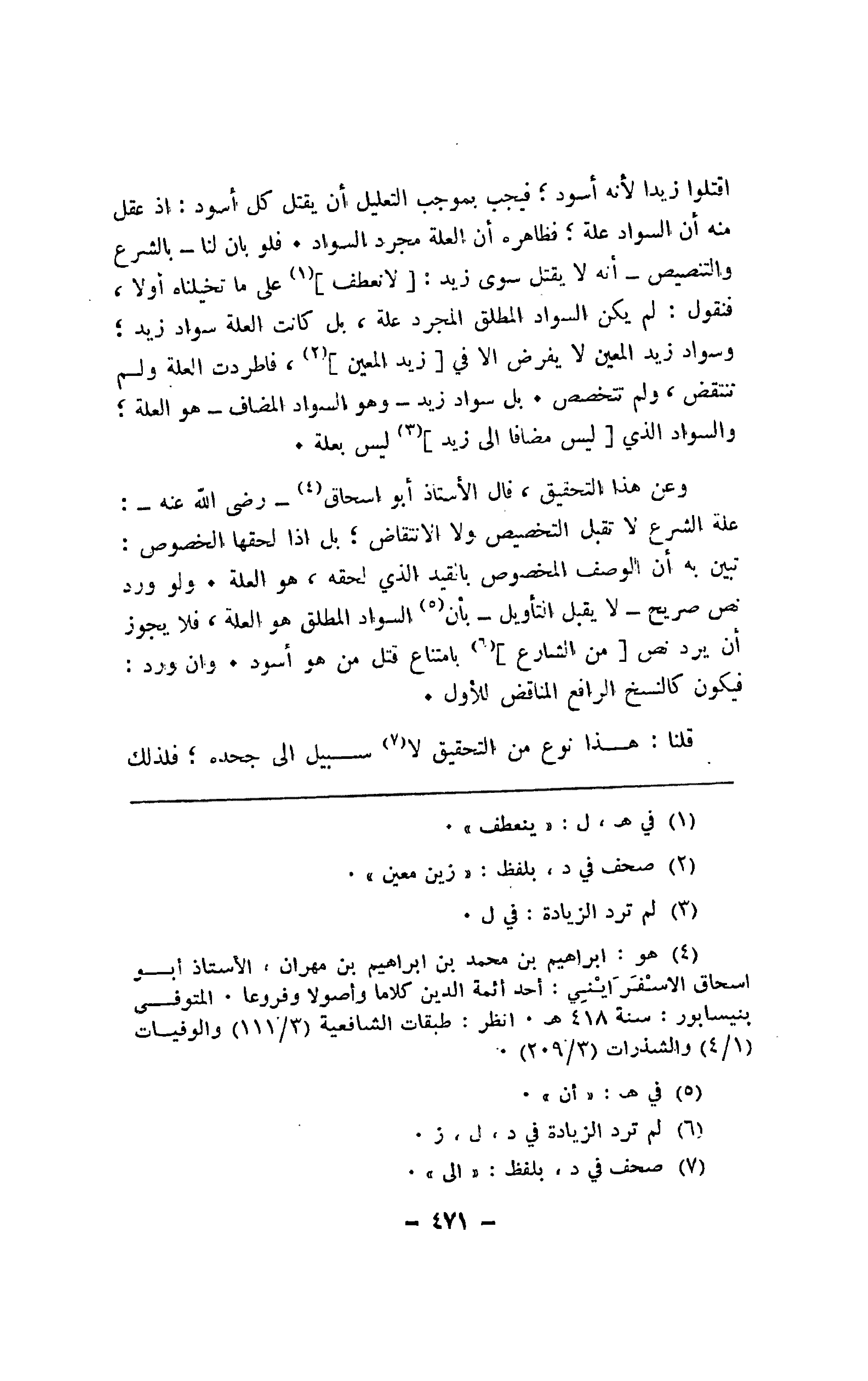 اقتلوا زيدًا لأنه أسود؛ فيجب بموجب التعليل أن يقتل كل أسود: إذ عقل منه أن السواد علة؛ فظاهره أن العلة مجرد السواد. فلو بان لنا -بالشرع والتنصيص -أنه لا يقتل سوى زيد: [لانعطف] على ما تخيلناه أولا، فنقول: لم يكن السواد المطلق المجرد علة، بل كانت العلة سواد زيد؛ وسواد زيد المعين لا يفرض إلا في [زيد المعين]، فاطردت العلة ولم تنتفض، ولم تتخصص. بل سواد زيد -وهو السواد المضاف -هو العلة؛ والسواد الذي [ليس مضافا إلى زيد] ليس بعلة.