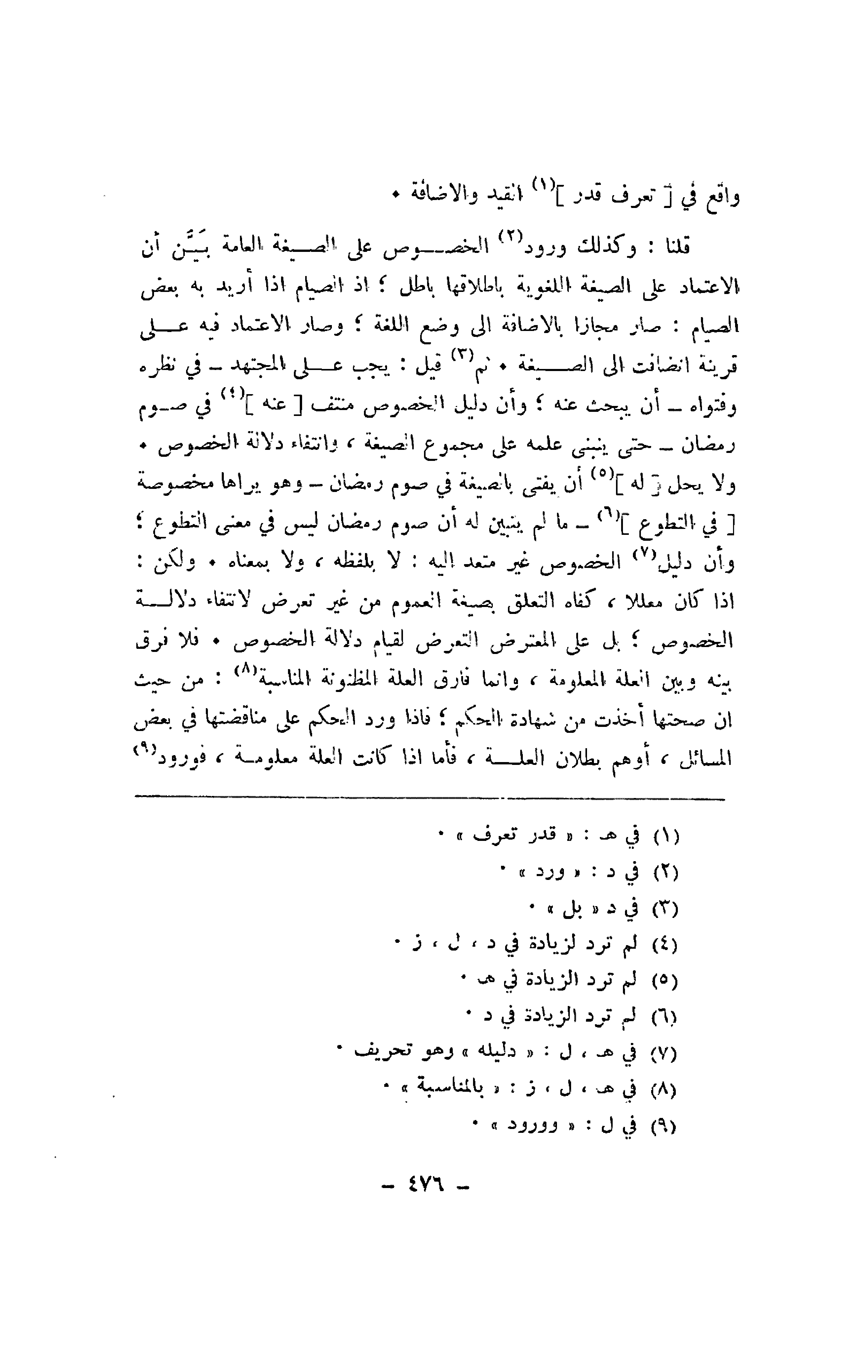قلنا: وكذلك ورود الخصوص على الصيغة العامة بين أن الاعتماد على الصيغة اللغوية بإطلاقها باطل؛ إذ الصيام إذا أريد به بعض الصيام: صار مجازا بالإضافة إلى وضع اللفة؛ وصار الاعتماد فيه على قرينة انضافت إلى الصيغة. ثم قيل: يجب على المجتهد -في نظره وفتواه -أن يبحث عنه؛ وأن دليل الخصوص منتف [عنه] في صوم رمضان -حتى ينبني علمه على مجموع الصيغة، وانتفاء دلالة الخصوص. [ولا يحل قوله] أن يفتى بالصيغة في صوم رمضان -وهو يراها مخصوصة [في التطوع]-ما لم يتبين له أن صوم رمضان ليس في معنى التطوع؛ وأن دليل الخصوص غير متعد إليه: لا بلفظه، ولا بمعناه. ولكن: إذا كان معللا، كفاه التعلق بصيغة العموم من غير تعرض لانتفاء دلالة الخصوص؛ بل على المعترض لقيام دلالة الخصوص. فلا فرق بينه وبين العلة المعلومة، وإنما فارق العلة المظنونة المناسبة: من حيث أن صحتها أخذت من شهادة الحكم، فإذا ورد الحكم على مناقضتها في بعض المسائل، أوهم بطلان العلة، فأما إذا كانت العلة معلومة، فورود