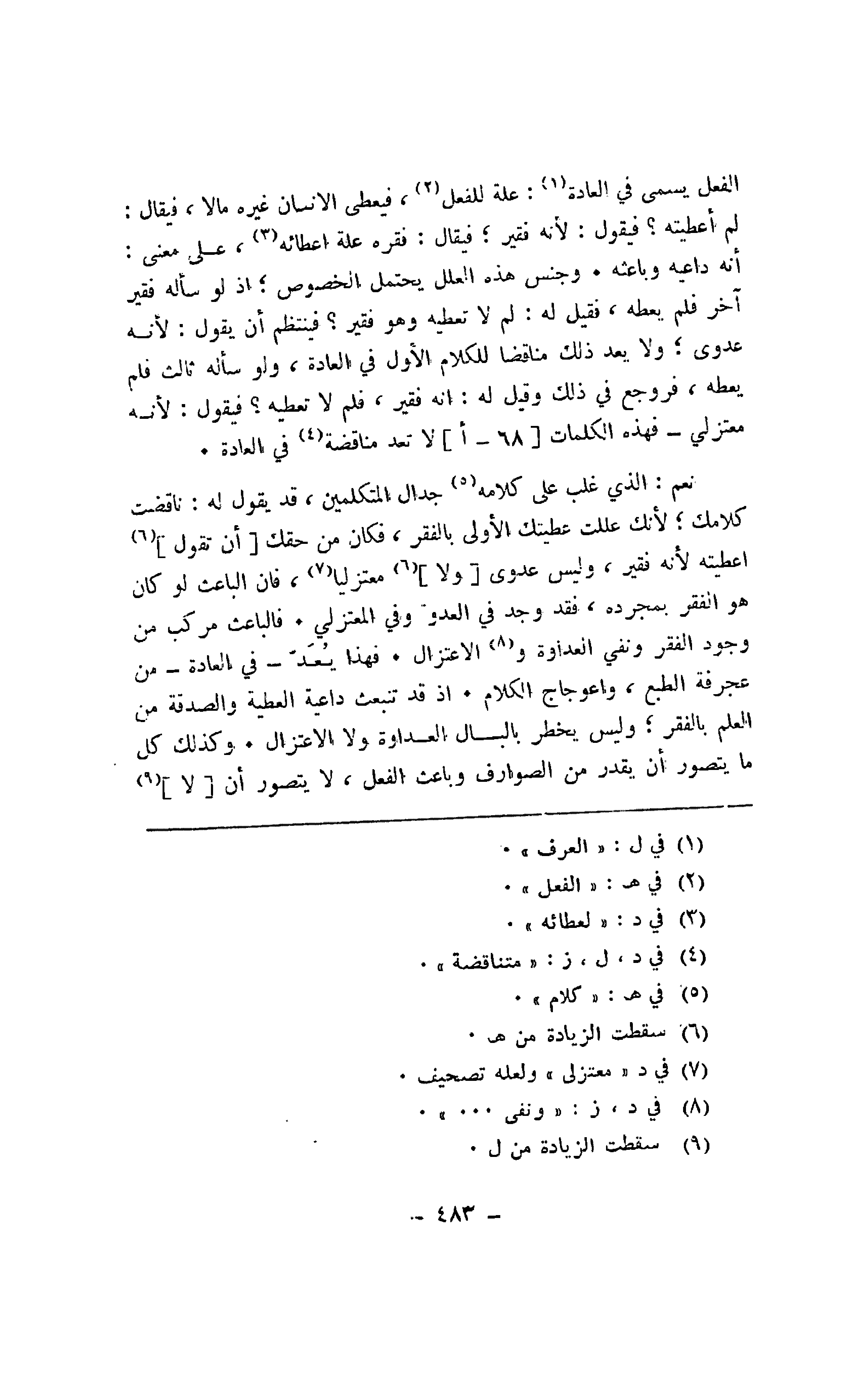 نعم: الذي غلب على كلامه جدال المتكلمين، قد يقول له: ناقضت كلامك؛ لأنك عللت عطيتك الأولى بالفقر، فكان من حقك [أن نقول] أعطيته لأنه فقير، وليس عدوي [ولا] معتزليا، فإن الباعث لو كان هو الفقر بمجرده، فقد وجد في العدو وفي المعتزلي. فالباعث مركب من وجود الفقر ونفي العداوة والاعتزال. فهذا يعد -في العادة -من عجرفة الطبع، واعوجاج الكلام. إذ قد تنبعث داعية العطية والصدقة من العلم بالفقر؛ وليس يخطر بالبال العداوة ولا الاعتزال. وكذلك كل ما يتصور أن يقدر من الصوارف وباعث الفعل، لا يتصور أن [لا]