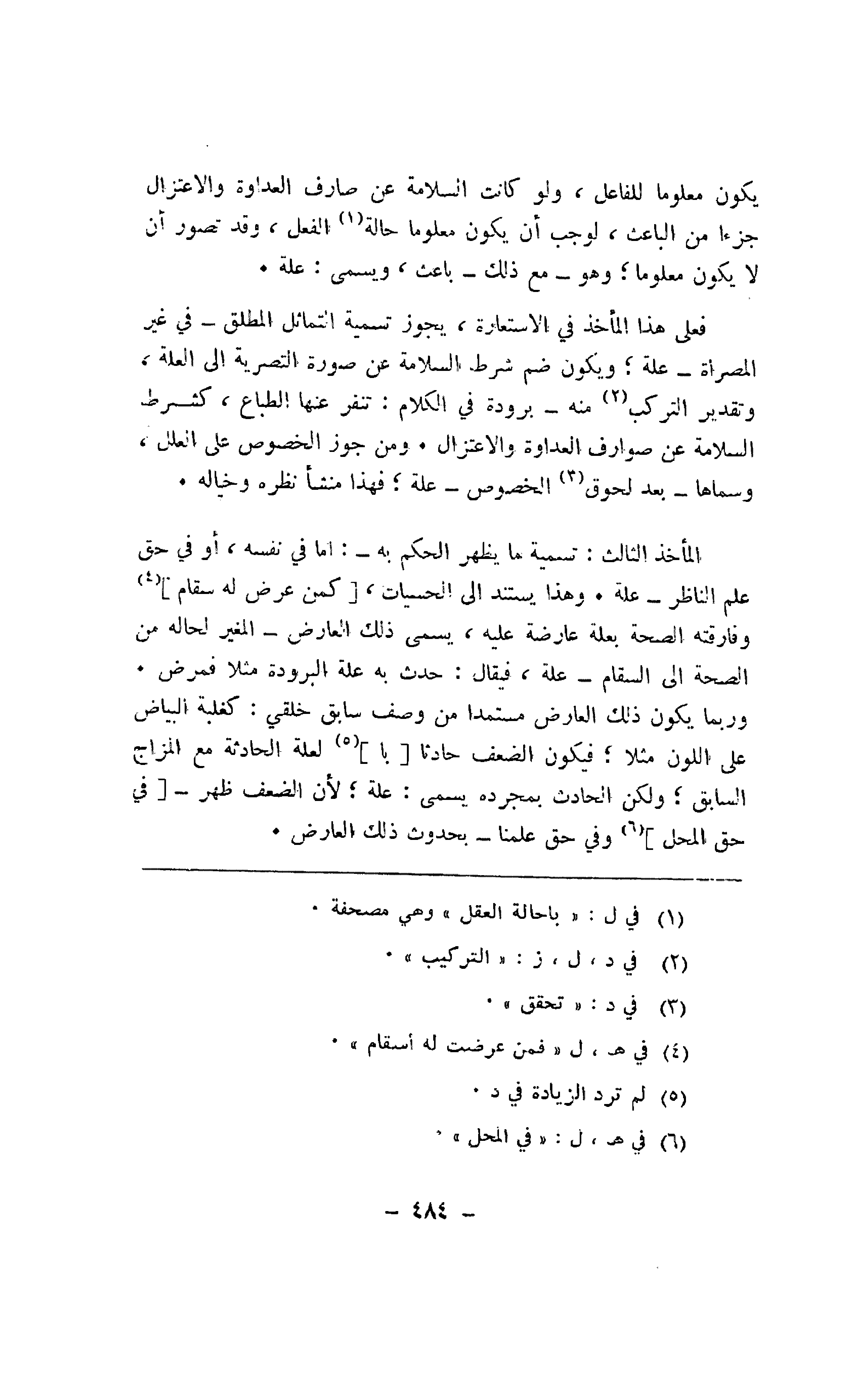 المأخذ الثالث: تسمية ما يظهر الحكم به -: أما في نفسه، أو في حق علم الناظر -علة. وهذا يستند إلى الحسيات، [كمن عرض له سقام] وفارقته الصحة بعلة عارضة عليه، يسمى ذلك العارض -المغير لحاله من الصحة إلى السقام -علة، فيقال: حدث به علة البرودة مثلا فمرض. وربما يكون ذلك العارض مستمدا من وصف سابق خلقي: كغلبة البياض على اللون مثلا؛ فيكون الضعف حادثا [با] لعلة الحادثة مع المزاج السابق؛ ولكن الحادث بمجرده يسمى: علة؛ لأن الضعف ظهر -[في حق المحل] وفي حق علمنا -بحدوث ذلك العارض.