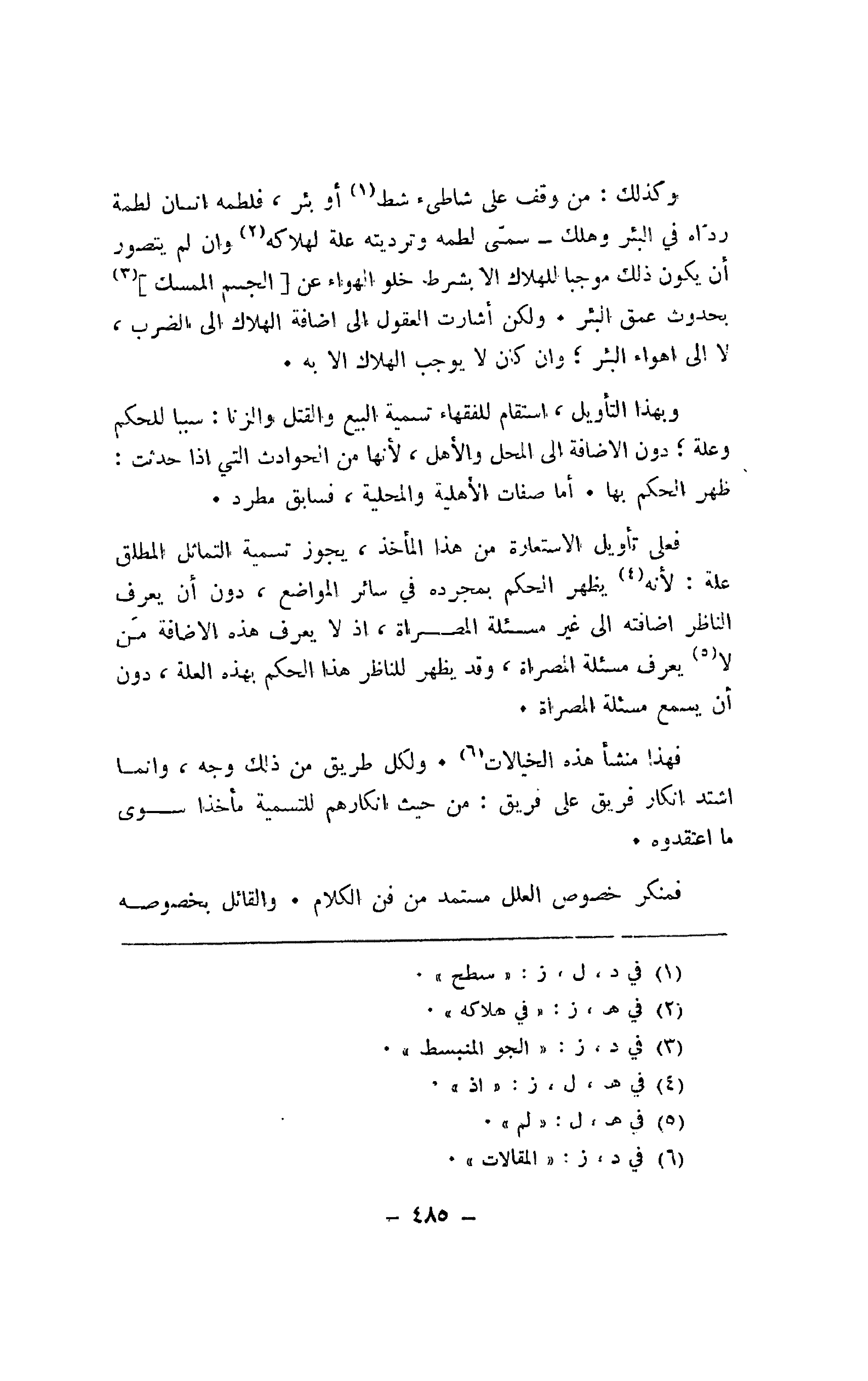 وكذلك: من وقف على شاطئ شط أو بئر، فلطمه إنسان لطمة رداه في البئر وهلك -سمي لطمه وترديته علة لهلاكه وإن لم يتصور أن يكون ذلك موجبا للهلاك إلا بشرط خلو الهواء عن [الجسم الممسك] بحدوث عمق البئر. ولكن أشارت العقول إلى إضافة الهلاك إلى الضرب، لا إلى أهواء البئر؛ وإن كان لا يوجب الهلاك إلا به.