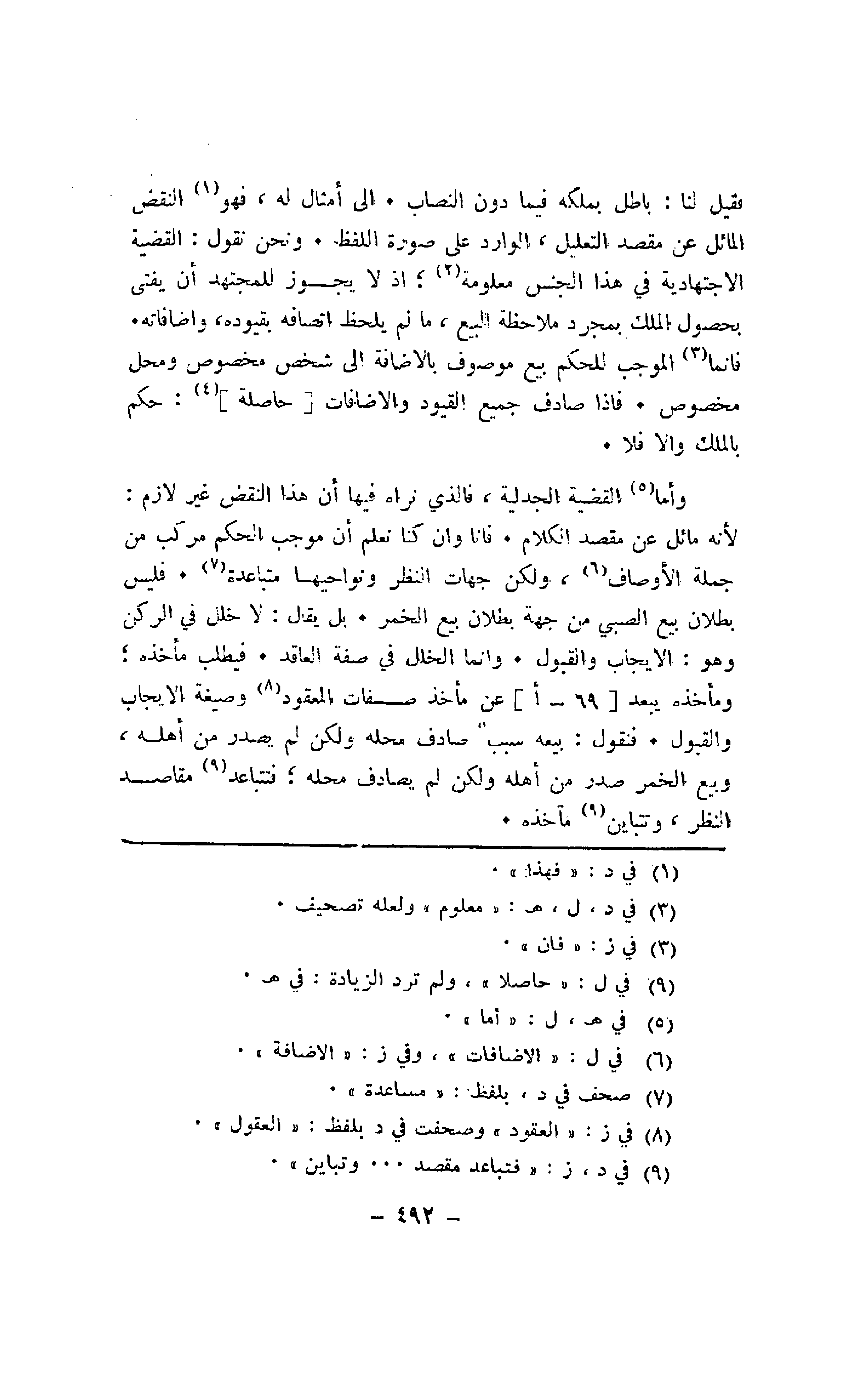 فقيل لنا: باطل بملكه فيما دون النصاب. إلى أمثال له، فهو النقض المائل عن مقصد التعليل، الوارد على صورة اللفظ. ونحن نقول: القضية الاجتهادية في هذا الجنس معلومة؛ إذ لا يجوز للمجتهد أن يفتي بحصول الملك بمجرد ملاحظة البيع، ما لم يلحظ اتصافه بقيوده، وإضافاته.