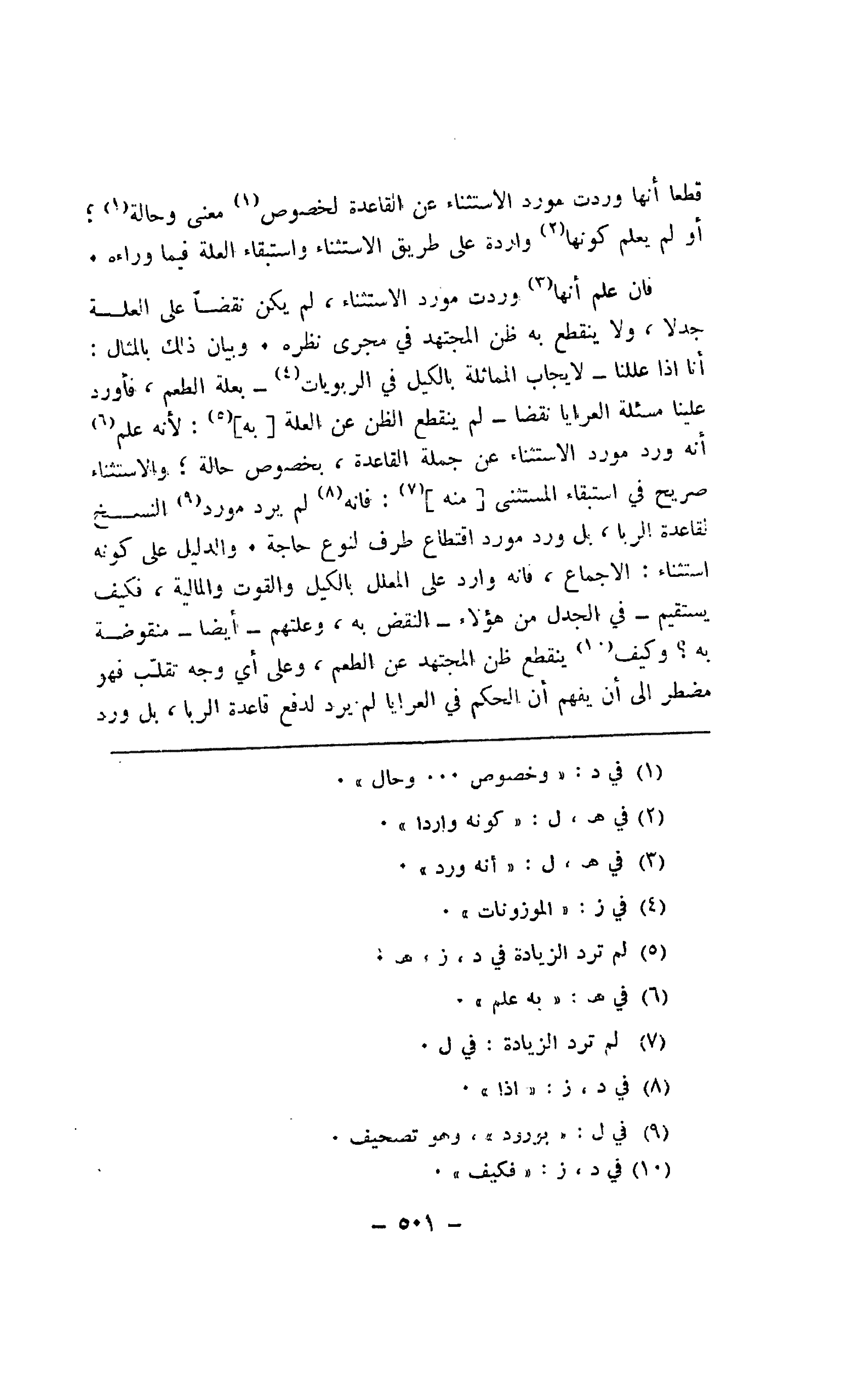 فإن علم أنها وردت مورد الاستثناء، لم يكن نقضا على العلة جدلا، ولا ينقطع به ظن المجتهد في مجرى نظره. وبيان ذلك بالمثال: أنا إذا عللنا -لإيجاب المماثلة بالكيل في الربويات -بعلة الطعم، فأورد علينا مسئلة العرايا نقضا -لم ينقطع الظن عن العلة [به]: لأنه علم أنه ورد مورد الاستثناء عن جملة القاعدة، بخصوص حالة؛ والاستثناء صريح في استبقاء المستثنى [منه]: فإنه لم يرد مورد النسخ لقاعدة الربا، بل ورد مورد اقتطاع طرف لنوع حاجة. والدليل على كونه استثناء: الإجماع، فإنه وارد على المعلل بالكيل والقوت والمالية، فكيف يستقيم -في الجدل من هؤلاء -النقض به، وعلتهم -أيضا -منقوضة به؟ وكيف ينقطع ظن المجتهد عن الطعم، وعلى أي وجه تقلب فهو مضطر إلى أن يفهم أن الحكم في العرايا لم يرد لدفع قاعدة الربا، بل ورد