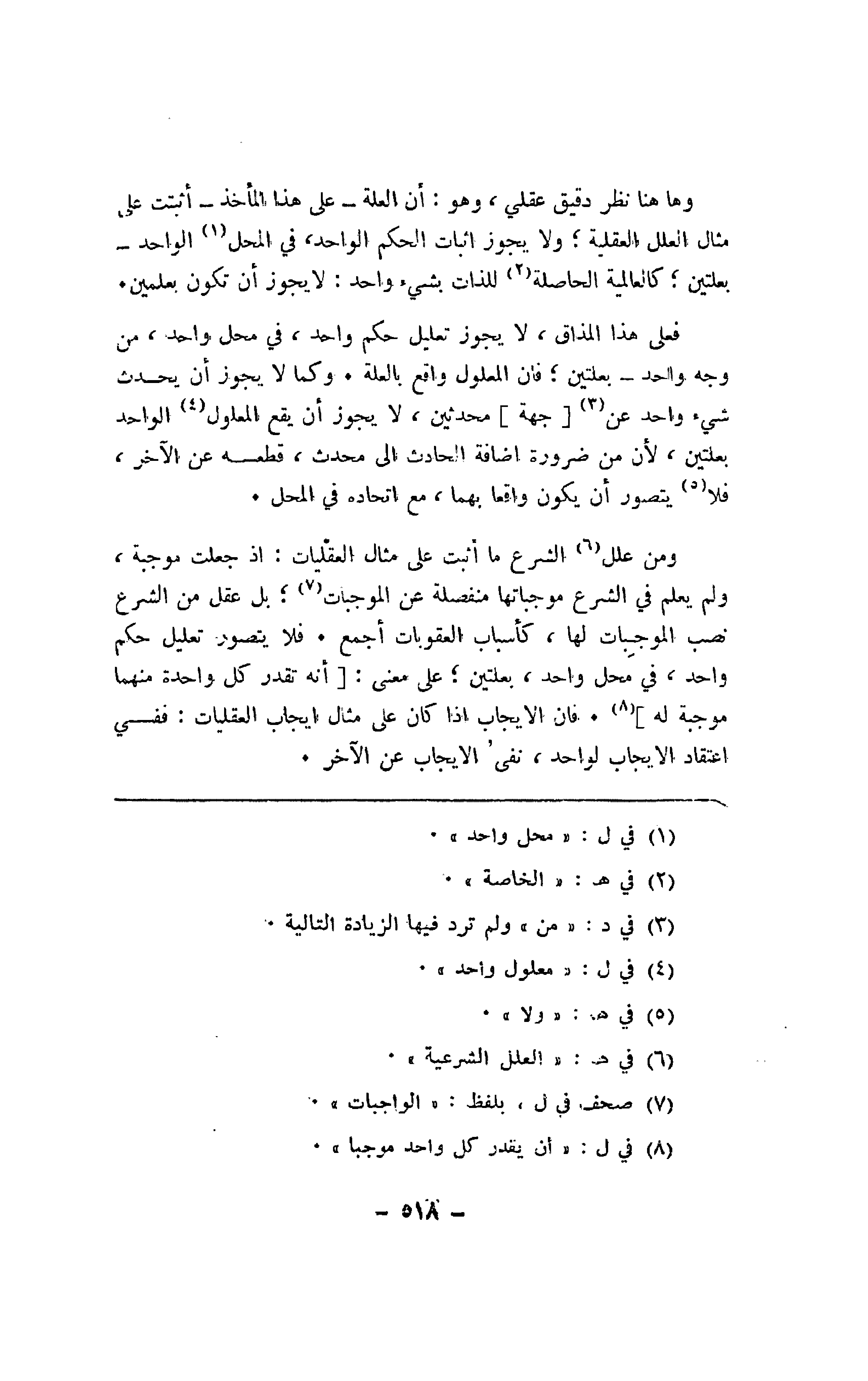 ومن علل الشرع ما أثبت على مثال العقليات: إذ جعلت موجبة، ولم يعلم في الشرع ما أثبت على مثال العقليات: إذ جعلت موجبة، ولم يعلم في الشرع موجباتها منفصلة عن الموجبات؛ بل عقل من الشرع نصب الموجبات لها، كأسباب العقوبات أجمع. فلا يتصور تعليل حكم واحد، في محل واحد، بعلتين؛ على معنى: [أنه تقدر كل واحدة منهما موجبة له]. فإن الإيجاب إذا كان على مثال إيجاب العقليات: ففي اعتقاد الإيجاب لواحد، نفي الإيجاب عن الآخر.