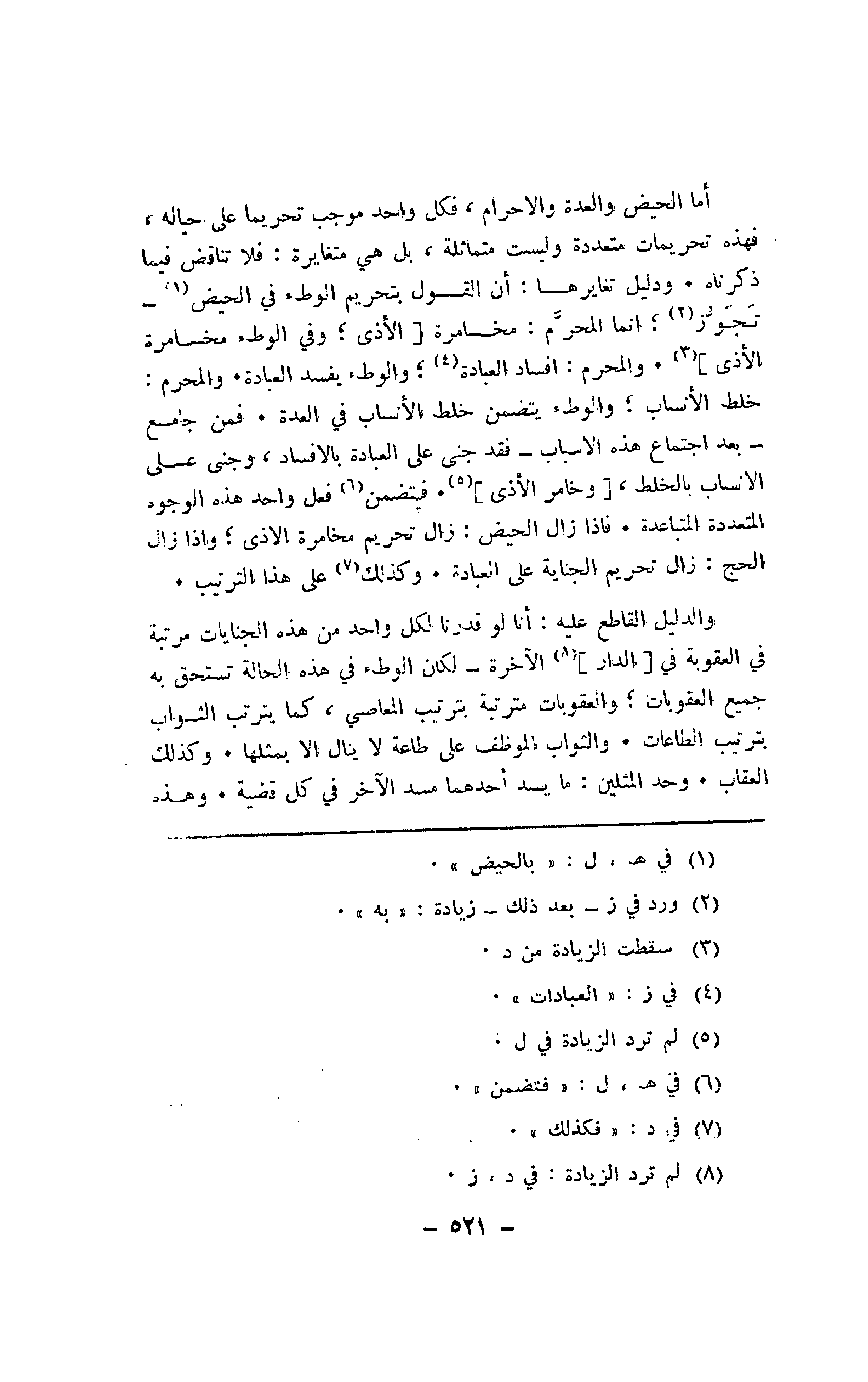 والدليل القاطع عليه: أنا لو قدرنا لكل واحد من هذه الجنايات مرتبة في العقوبة في [الدار] الآخرة -لكان الوطء في هذه الحالة تستحق به جميع العقوبات؛ والعقوبات مترتبة بترتيب المعاصي، كما يترتب الثواب بترتيب الطاعات. والثواب الموظف على طاعة لا ينال إلا بمثلها. وكذلك العقاب. وحد المثلين: ما يسد أحدهما مسد الآخر في كل قضية. وهذه