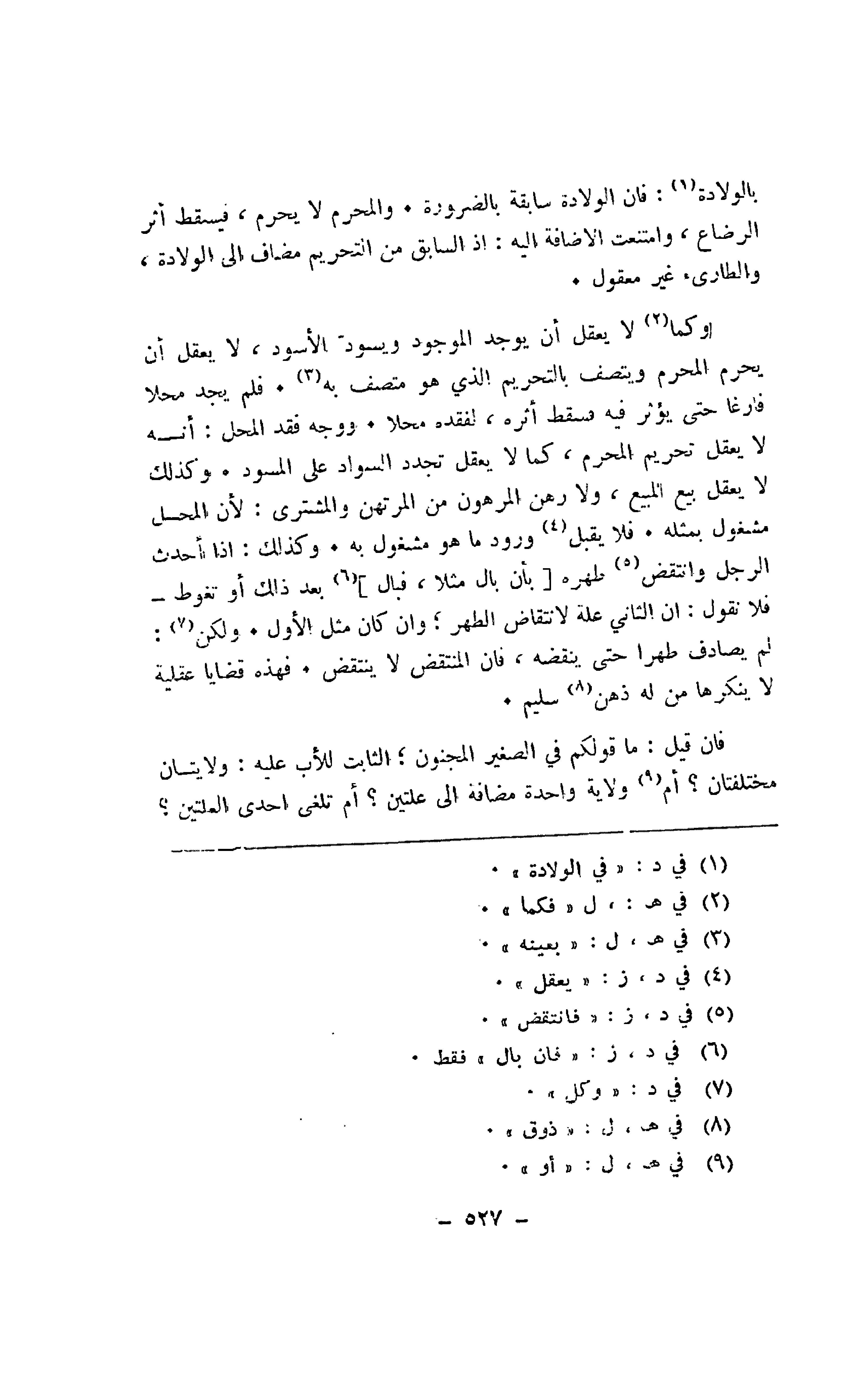 وكما لا يعقل أن يوجد الموجود ويسود الأسود، لا يعقل أن يحرم المحرم ويتصف بالتحريم الذي هو متصف به. فلم يجد محلا فارغا حتى يؤثر فيه فسقط أثره، لفقده محلا. ووجه فقد المحل: أنه لا يعقل تحريم المحرم، كما لا يعقل تجدد السواد على السود. وكذلك لا يعقل بيع المبيع، ولا رهن المرهون من المرتهن والمشتري: لأن المحل مشغول بمثله. فلا يقبل ورود ما هو مشغول به. وكذلك: إذا أحدث الرجل وانتقض طهره [بأن بال مثلا، فبال] بعد ذلك أو تغوط -فلا نقول: إن الثاني علة لانتقاض الطهر؛ وإن كان مثل الأول. ولكن: لم يصادف طهرا حتى ينقضه، فإن المنتقض لا ينتقض. فهذه قضايا عقلية لا ينكرها من له ذهن سليم.