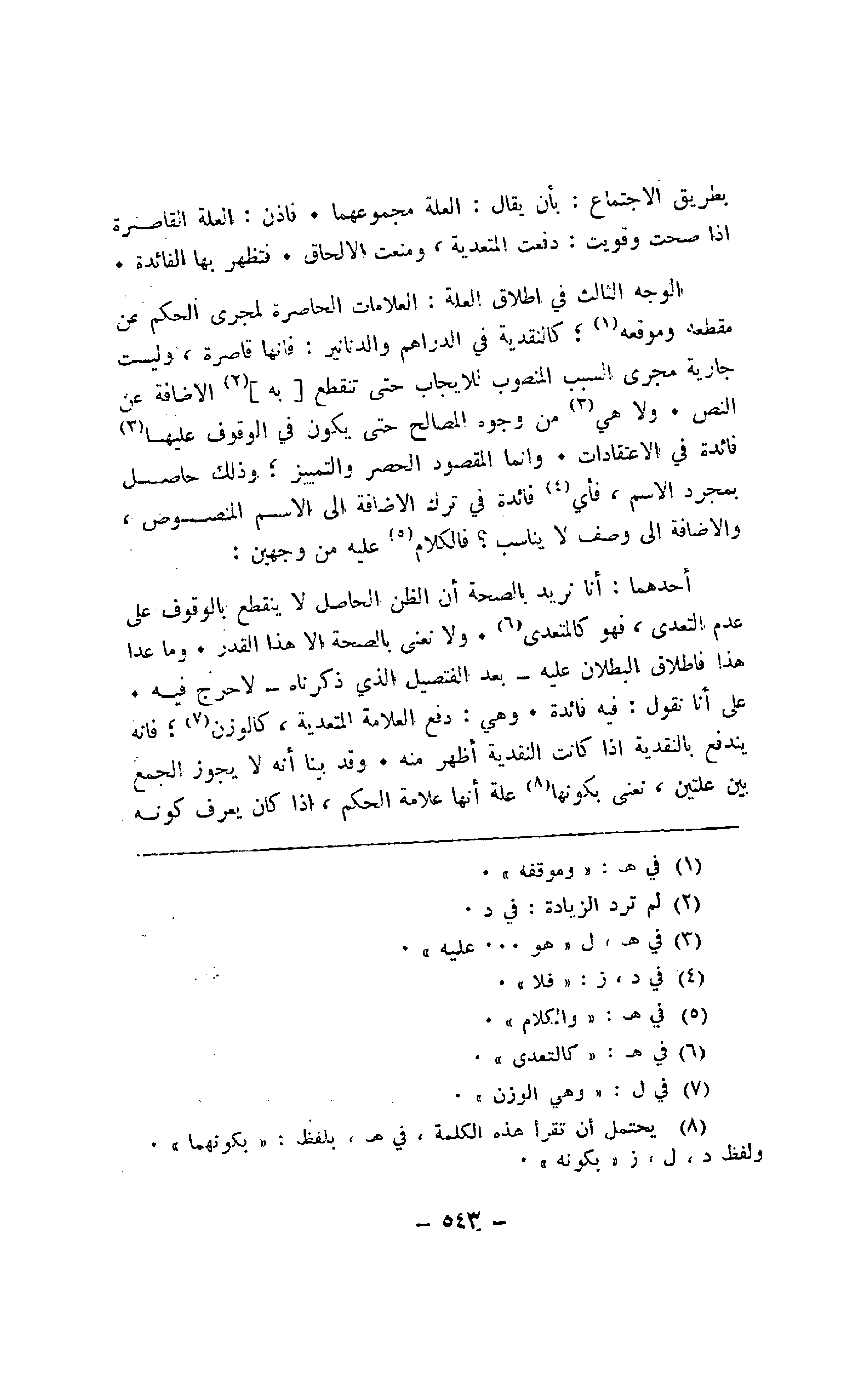 الوجه الثالث في إطلاق العلة: العلامات الحاصرة لمجرى الحكم عن مقطعه وموقعه؛ كالنقدية في الدراهم والدنانير: فإنها قاصرة، وليست جارية مجرى السبب المنصوب للإيجاب حتى تنقطع [به] الإضافة عن النص. ولا هي من وجوه المصالح حتى يكون في الوقوف عليها فائدة في الاعتقادات. وإنما المقصود الحصر والتمييز؛ وذلك حاصل بمجرد الاسم، فأي فائدة في ترك الإضافة إلى الاسم المنصوص، والإضافة إلى وصف لا يناسب؟ فالكلام عليه من وجهين: