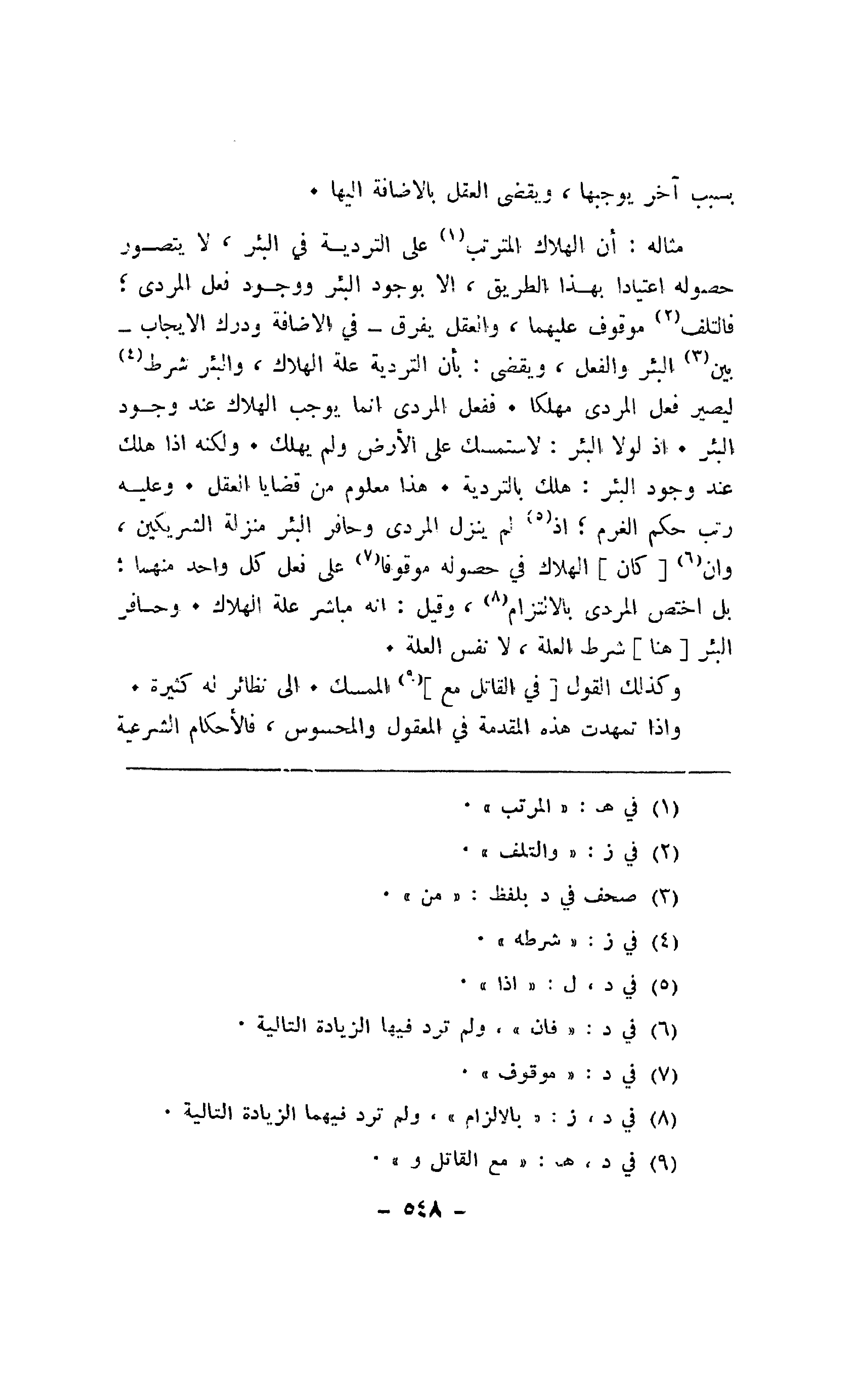 مثاله: أن الهلاك المترتب على التردية في البئر، لا يتصور حصوله اعتيادا بهذا الطريق، إلا بوجود البئر ووجود فعل المردي؛ فالتلف موقوف عليهما، والعقل يفرق -في الإضافة ودرك الإيجاب -بين البئر والفعل، ويقضي: بأن التردية علة الهلاك، والبئر شرط ليصير فعل المردي مهلكا. ففعل المردي إنما يوجب الهلاك عند وجود البئر. إذ لولا البئر: لاستمسك على الأرض ولم يهلك. ولكنه إذا هلك عند وجود البئر: هلك بالتردية. هذا معلوم من قضايا العقل. وعليه رتب حكم الغرم؛ إذ لم ينزل المردي وحافز البئر منزلة الشريكين، وإن [كان] الهلاك في حصوله موقوفا على فعل كل واحد منهما: بل اختص المردي بالالتزام، وقيل: إنه مباشر علة الهلاك. وحافز البئر [هنا] شرط العلة، لا نفس العلة.