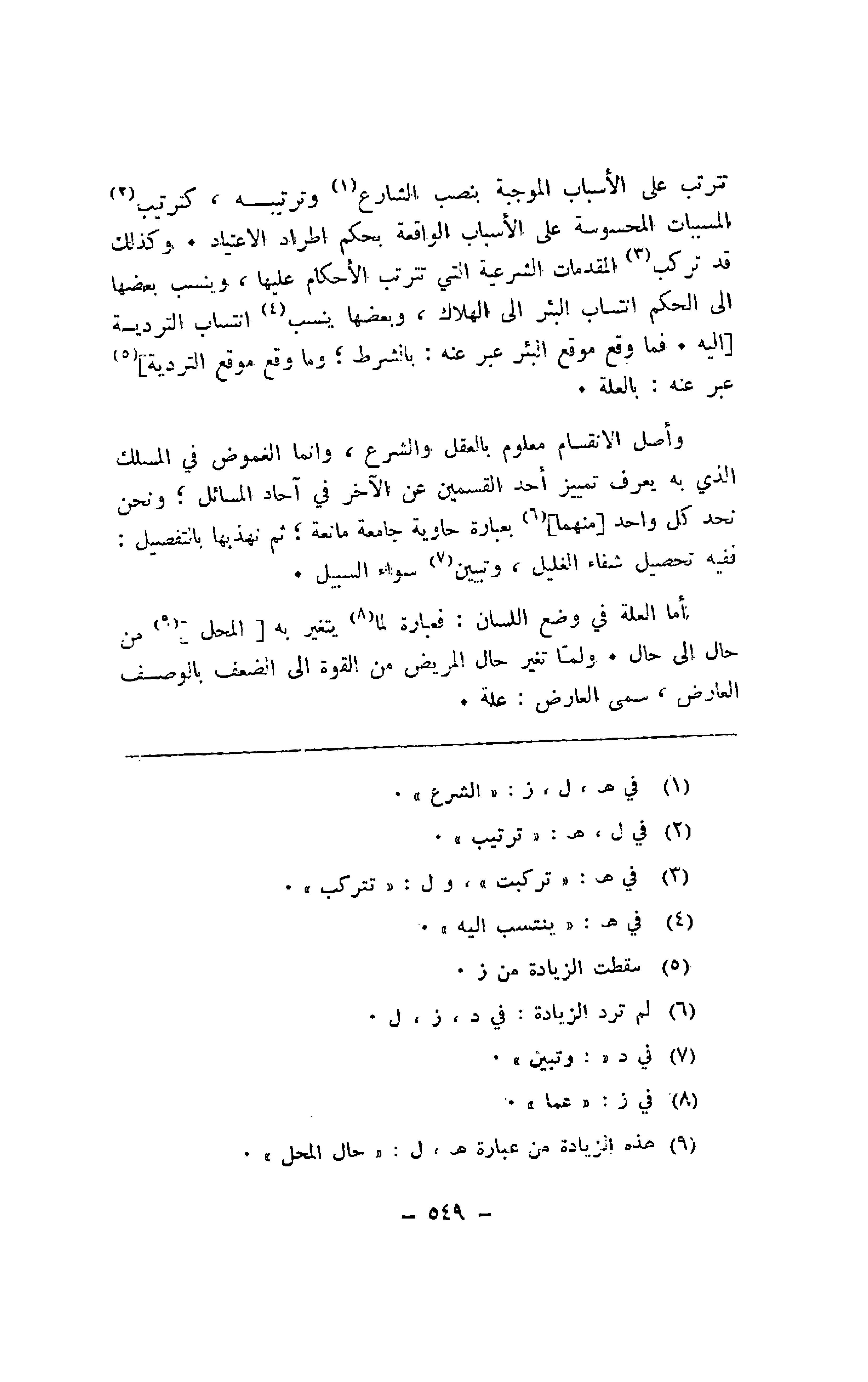 ترتب على الأسباب الموجبة بنصب الشارع وترتيبه، كترتيب المسببات المحسوسة على الأسباب الواقعة بحكم اطراد الاعتياد. وكذلك قد تركب المقدمات الشرعية التي تترتب الأحكام عليها، وينسب بعضها إلى الحكم انتساب البئر إلى الهلاك، وبعضها ينسب انتساب التردية [إليه. فما وقع موقع البئر عبر عنه: بالشرط؛ وما وقع موقع التردية] عبر عنه: بالعلة.