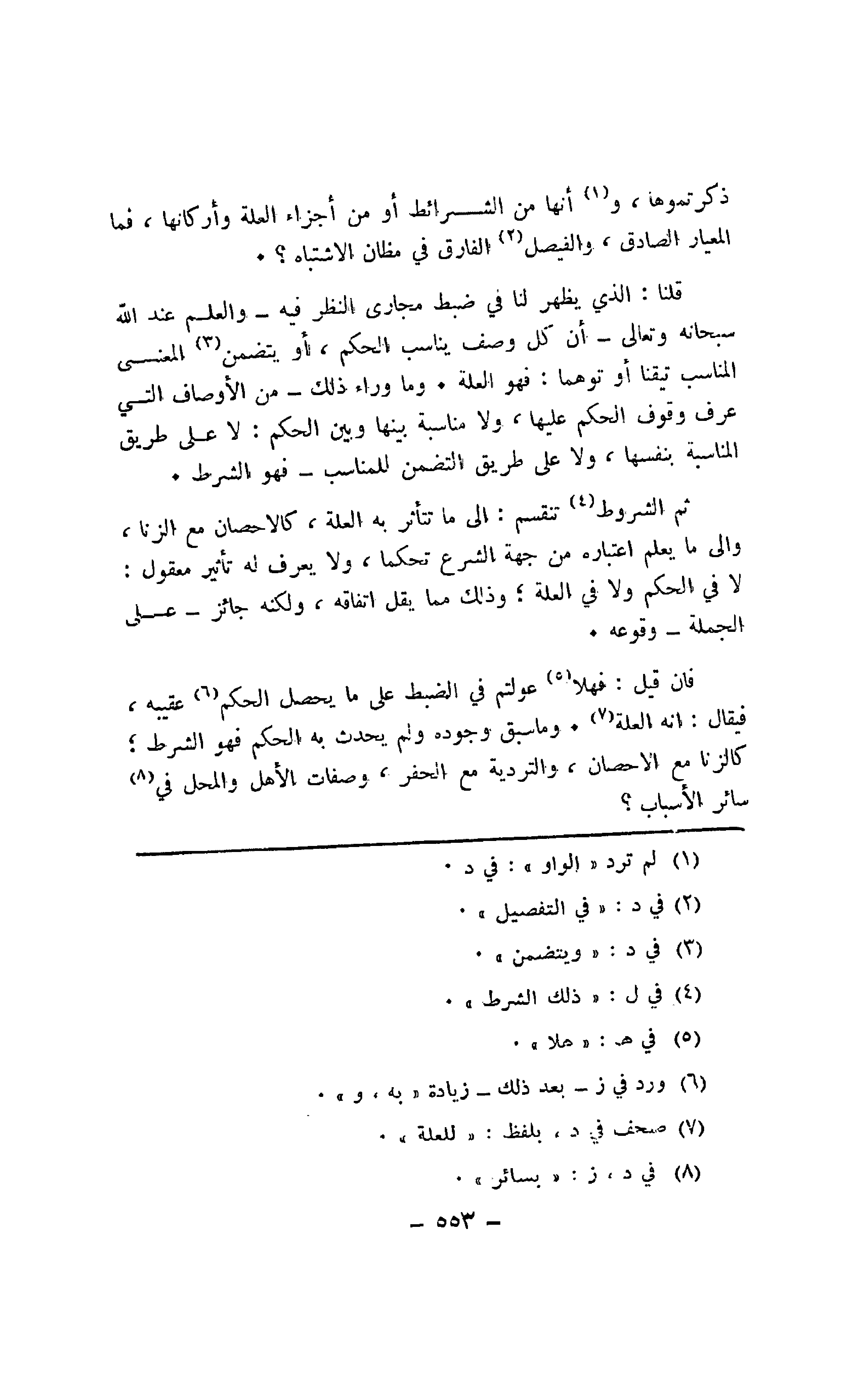 قلنا: الذي يظهر لنا في ضبط مجارى النظر فيه -والعلم عند الله سبحانه وتعالى -أن كل وصف يناسب الحكم، أو يتضمن المعنى المناسب تيقنا أو توهما: فهو العلة. وما وراء ذلك =من الأوصاف التي عرف وقوف الحكم عليها، ولا مناسبة بينها وبين الحكم: لا على طريق المناسبة بنفسها، ولا على طريق التضمن للمناسب -فهو الشرط.