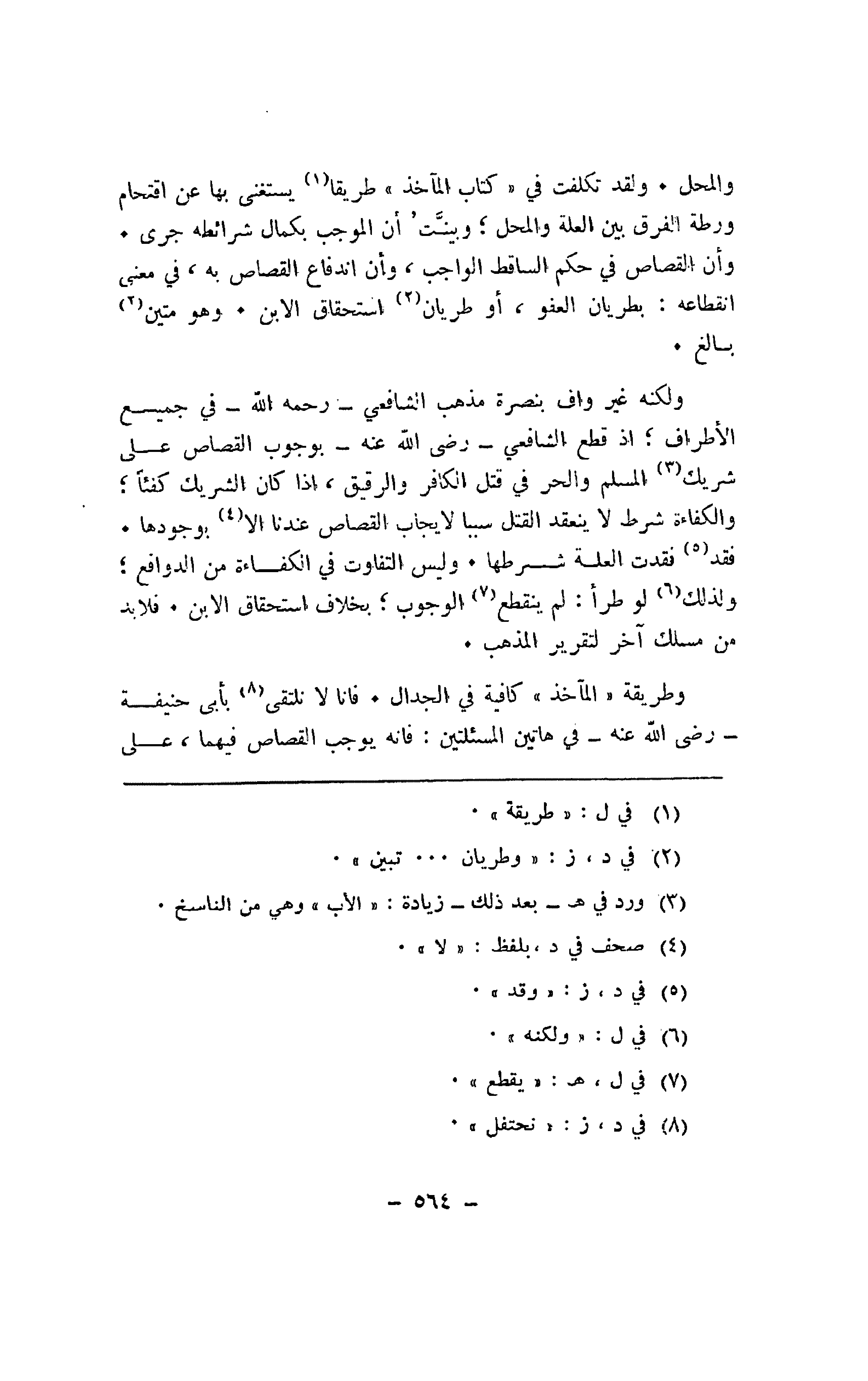 وطريقة "المآخذ" كافية في الجدال. فأنا لا نلتقي بأبي حنيفة -رضي الله عنه- في هاتين المسئلتين: فأنه يوجب القصاص فيهما، على