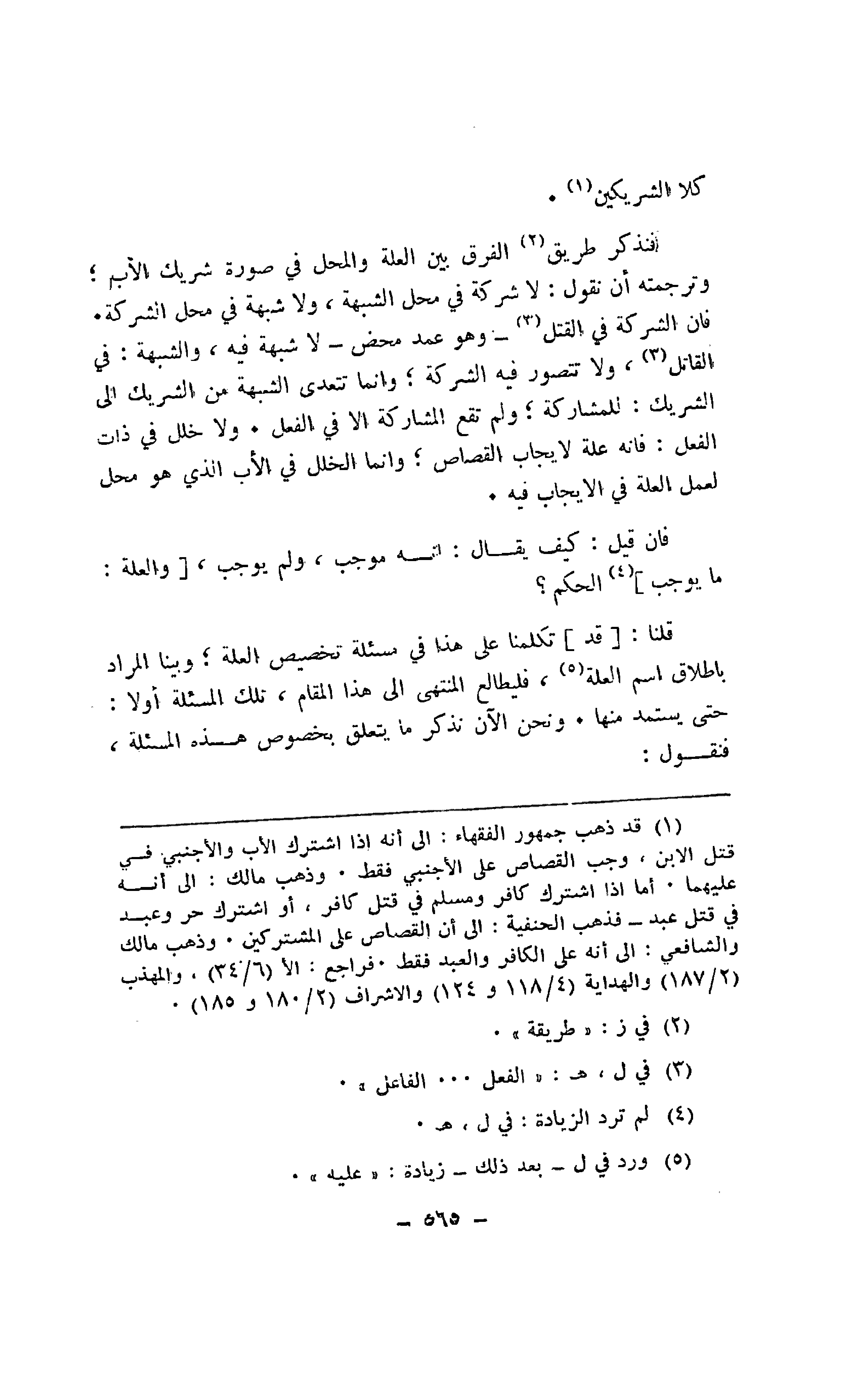 فنذكر طريق الفرق بين العلة والمحل في صورة شريك الأب؛ وترجمته أن نقول: لا شركة في محل الشبهة، ولا شبهة في محل الشركة. فإن الشركة في القتل -وهو عمد محض- لا شبهة فيه، والشبهة: في القاتل، ولا تتصور فيه الشركة؛ وإنما تتعدى الشبهة من الشريك إلى الشريك: للمشاركة؛ ولم تقع المشاركة إلا في الفعل. ولا خلل في ذات الفعل: فإنه علة لإيجاب القصاص؛ وإنما الخلل في الأب الذي هو محل لعمل العلة في الإيجاب فيه.