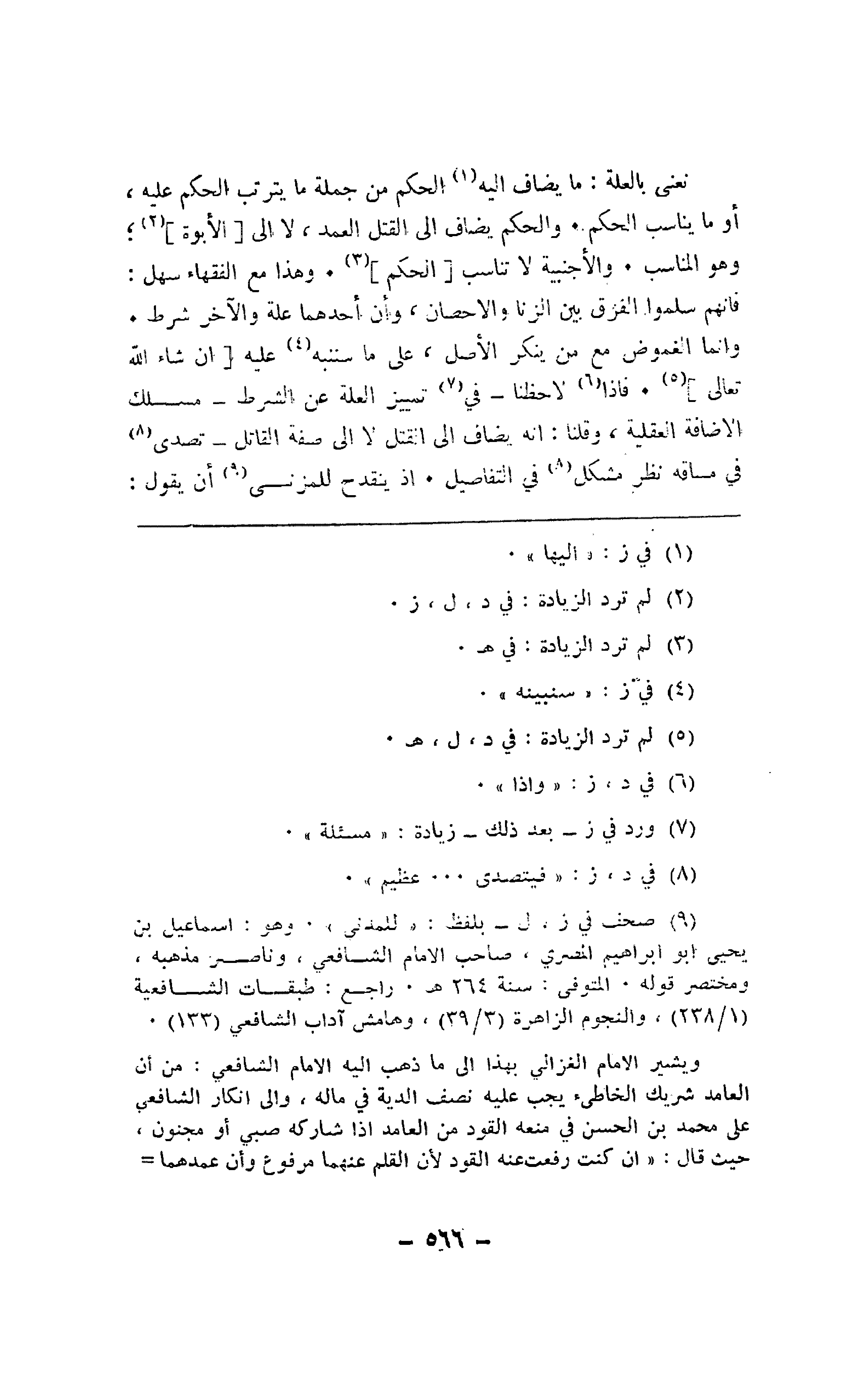 نعني بالعلة: ما يضاف إليه الحكم من جملة ما يترتب الحكم عليه، أو ما يناسب الحكم. والحكم يضاف إلى القتل العمد، لا إلى [الأبوة]؛ وهو المناسب. والأجنبية لا تناسب [الحكم]. وهذا مع الفقهاء سهل: فإنهم سلموا الفرق بين الزنا والإحصان، وأن أحدهما علة والآخر شرط. وإنما الغموض مع من ينكر الأصل، على ما سننبه عليه [إن شاء الله تعالى]. فإذا لاحظنا -في تمييز العلة عن الشرط- مسلك الإضافة العقلية، وقلنا: إنه يضاف إلى القتل لا إلى صفة القاتل- تصدى في مساقه نظر مشكل في التفاصيل. إذ ينقدح للمزني أن يقول: