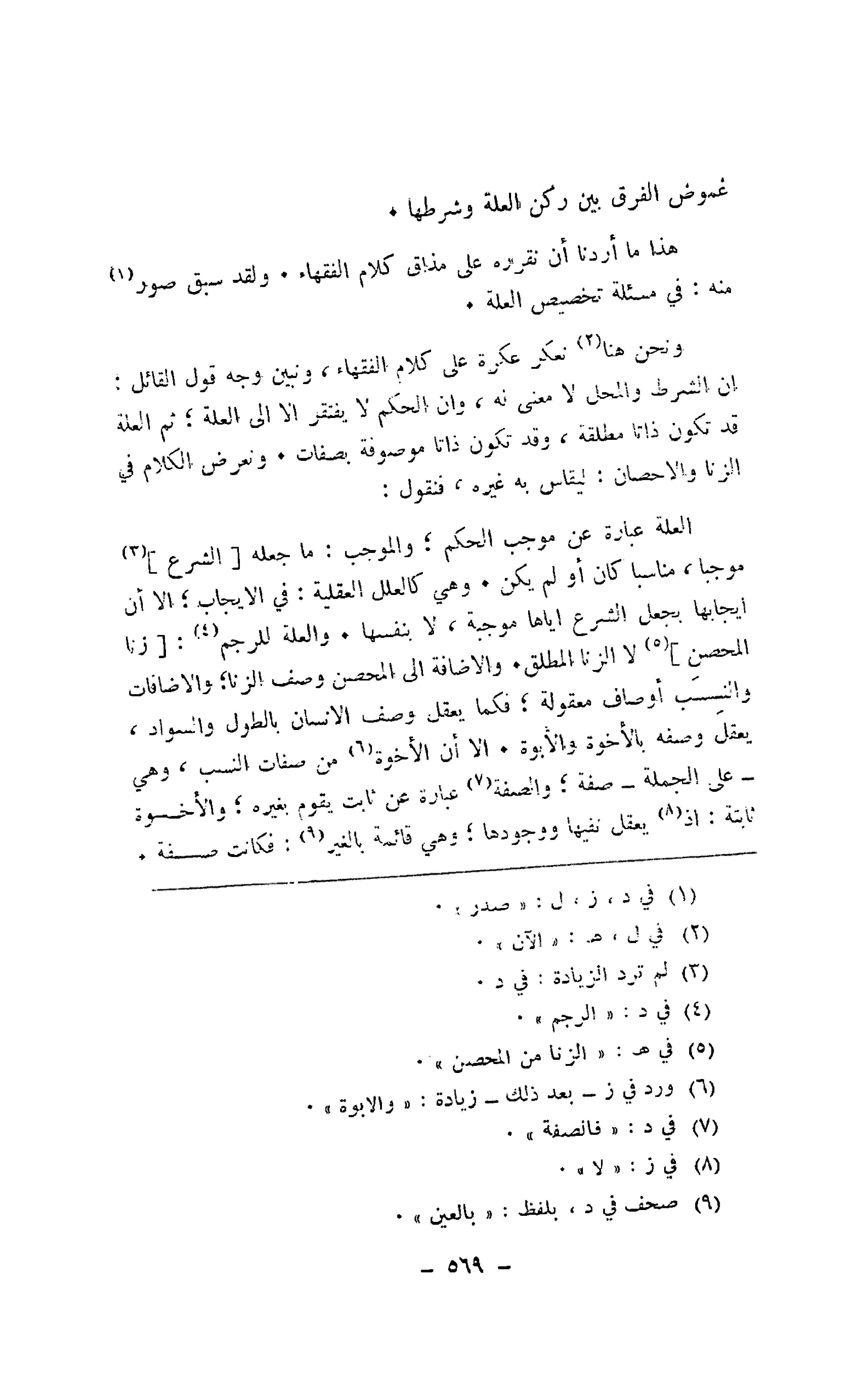 العلة عبارة عن موجب الحكم؛ والموجب: ما جعله [الشرع] موجبًا، مناسبًا كان أو لم يكن. وهي كالعلل العقلية: في الإيجاب؛ إلا أن إيجابها بجعل الشرع إياها موجبة، لا بنفسها. والعلة للرجم: [زنا المحصن] لا الزنا المطلق. والإضافة إلى المحصن وصف الزنا؛ والإضافات والنسب أوصاف معقولة؛ فكما يعقل وصف الإنسان بالطول والسواد، يعقل وصفه بالأخوة والأبوة. إلا أن الأخوة من صفات النسب، وهي ثابتة: إذ يعقل نفيها ووجودها؛ وهي قائمة بالغير: فكانت صفة.