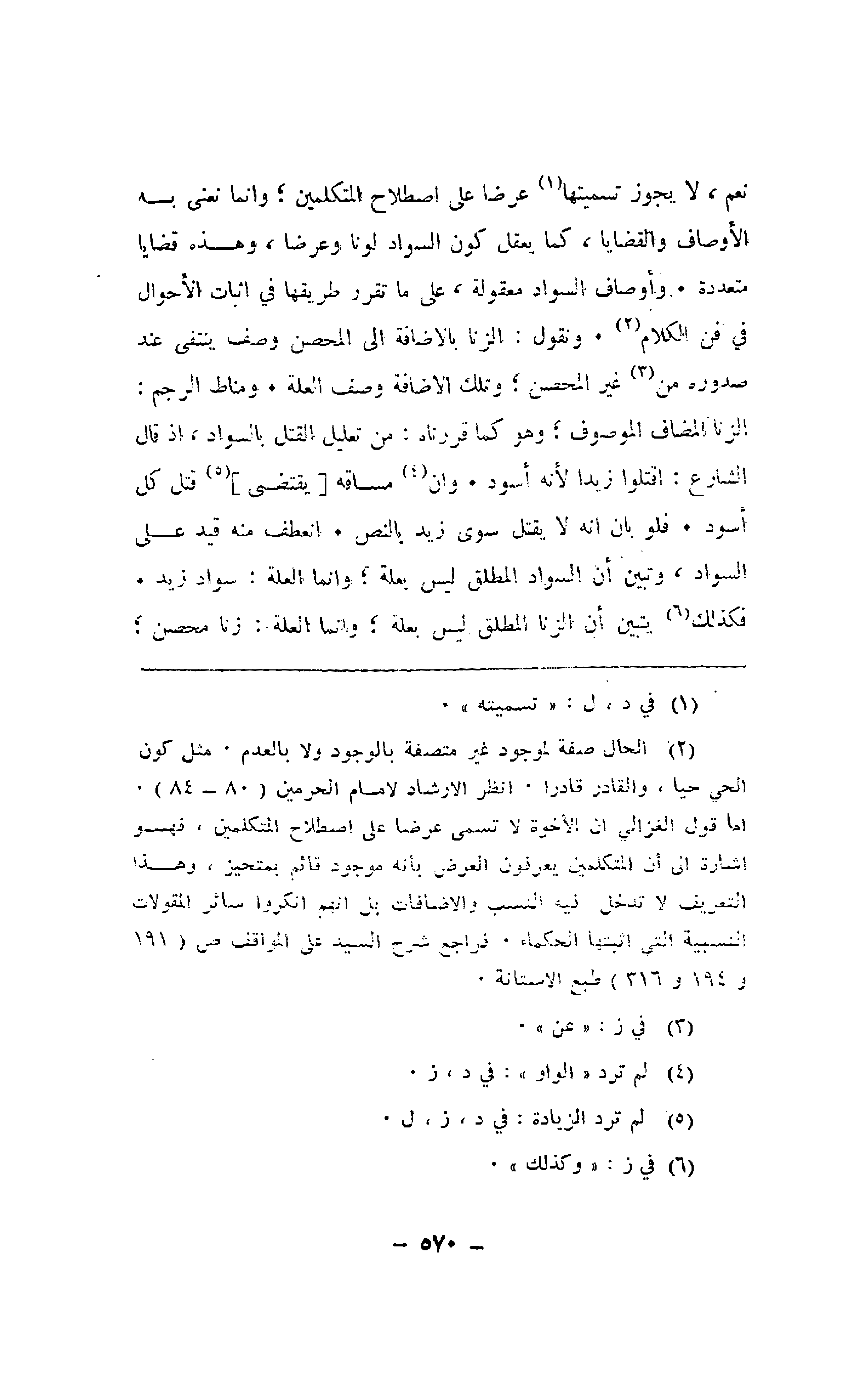 نعم، لا يجوز تسميتها عرضًا على اصطلاح المتكلمين؛ وإنما نعني به الأوصاف والقضايا، كما يعقل كون السواد لونًا وعرضًا، وهذه قضايا متعددة. وأوصاف السواد معقولة، على ما تقرر طريقها في إثبات الأحوال في فن الكلام. ونقول: الزنا بالإضافة إلى المحصن وصف ينتفي عند صدوره من غير المحصن؛ وتلك الإضافة وصف العلة. ومناط الرجم: الزنا المضاف الموصوف؛ وهو كما قررناه: من تعليل القتل بالسواد، إذ قال الشارع: اقتلوا زيدًا لأنه أسود. وأن مساقه [يقتضي] قتل كل أسود. فلو بان أنه لا يقتل سوى زيد بالنص. انعطف منه قيد على السواد، وتبين أن السواد المطلق ليس بعلة؛ وإنما العلة: سواد زيد. فكذلك يتبين أن الزنا المطلق ليس بعلة، وإنما العلة: زنا محصن؛