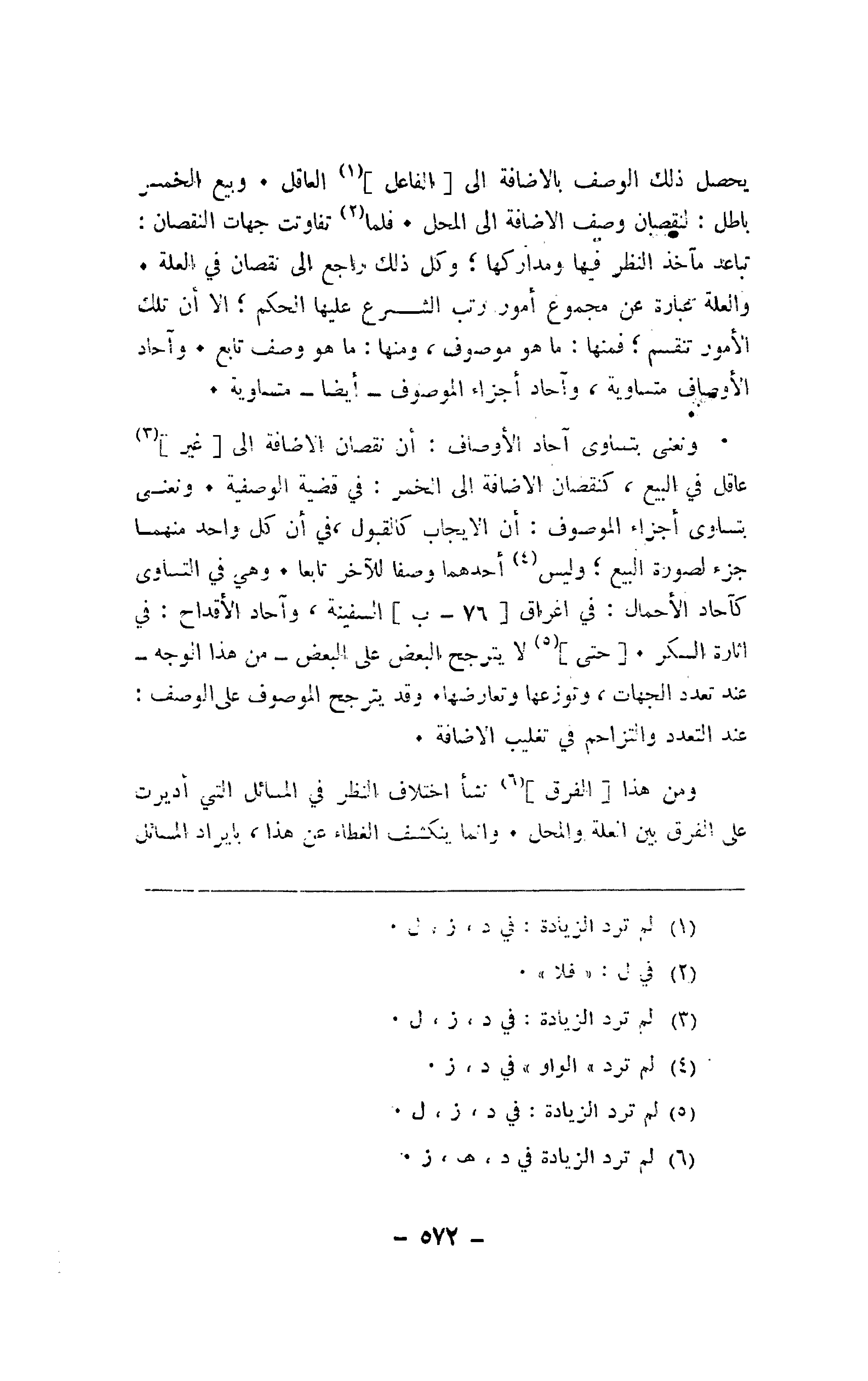 يحصل ذلك الوصف بالإضافة إلى [الفاعل] العاقل. وبيع الخمر باطل: لنقصان وصف الإضافة إلى المحل. فلما تفاوتت جهات النقصان: تباعد مآخذ النظر فيها ومداركها؛ وكل ذلك راجع إلى نقصان في العلة. والعلة عبارة عن مجموع أمور رتب الشرع عليها الحكم؛ إلا أن تلك الأمور تنقسم؛ فمنها: ما هو موصوف، ومنها: ما هو وصف تابع. وآحاد الأوصاف متساوية، وآحاد أجزاء الموصوف -أيضًا- متساوية.