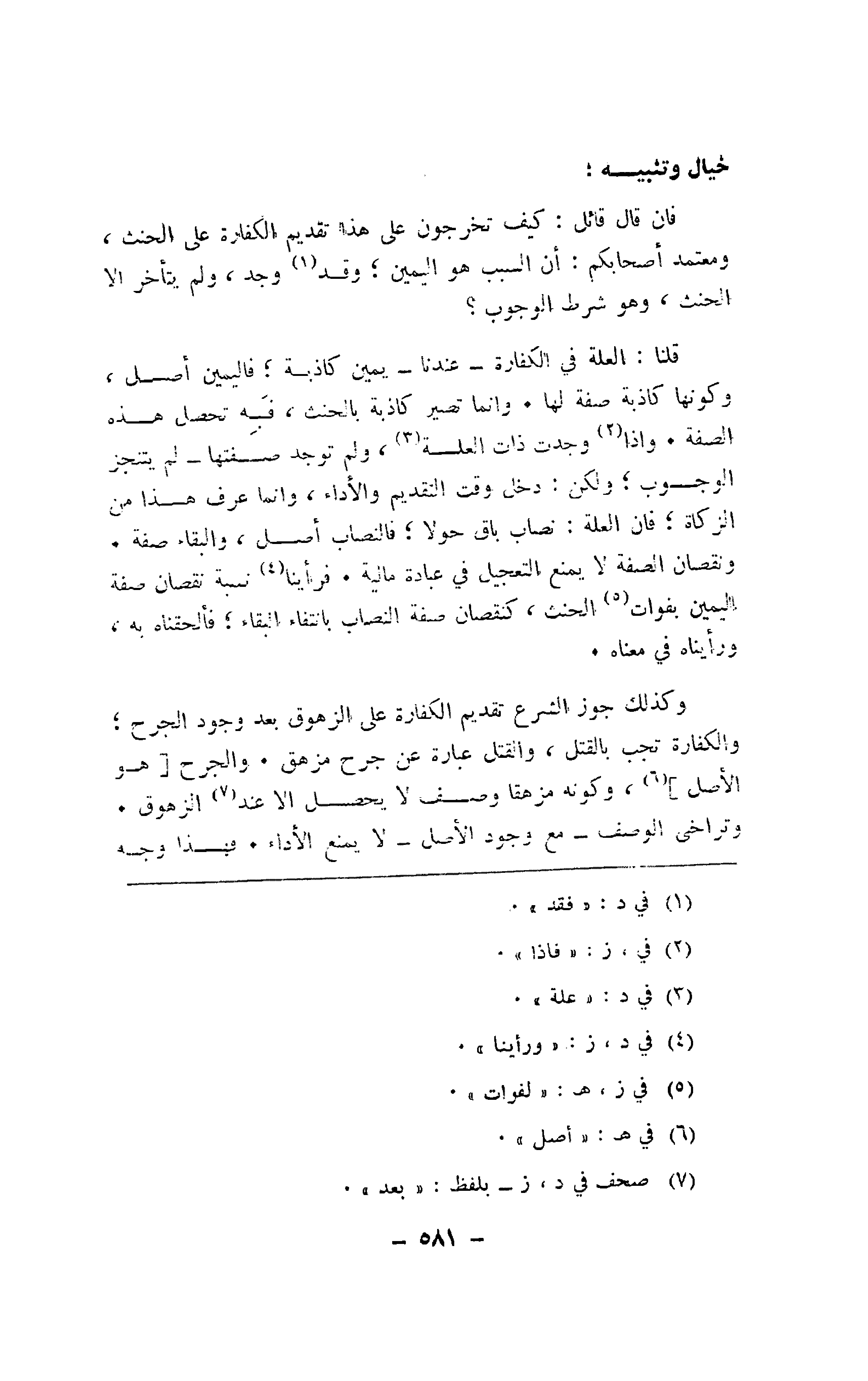 وكذلك جوز الشرع تقديم الكفارة على الزهوق بعد وجود الجرح؛ والكفارة تجب بالقتل، والقتل عبارة عن جرح مزهق. والجرح [هو الأصل]، وكونه مزهقًا وصف لا يحصل إلا عند الزهوق. وتراخي الوصف -مع وجود الأصل- لا يمنع الأداء. فهذا وجه