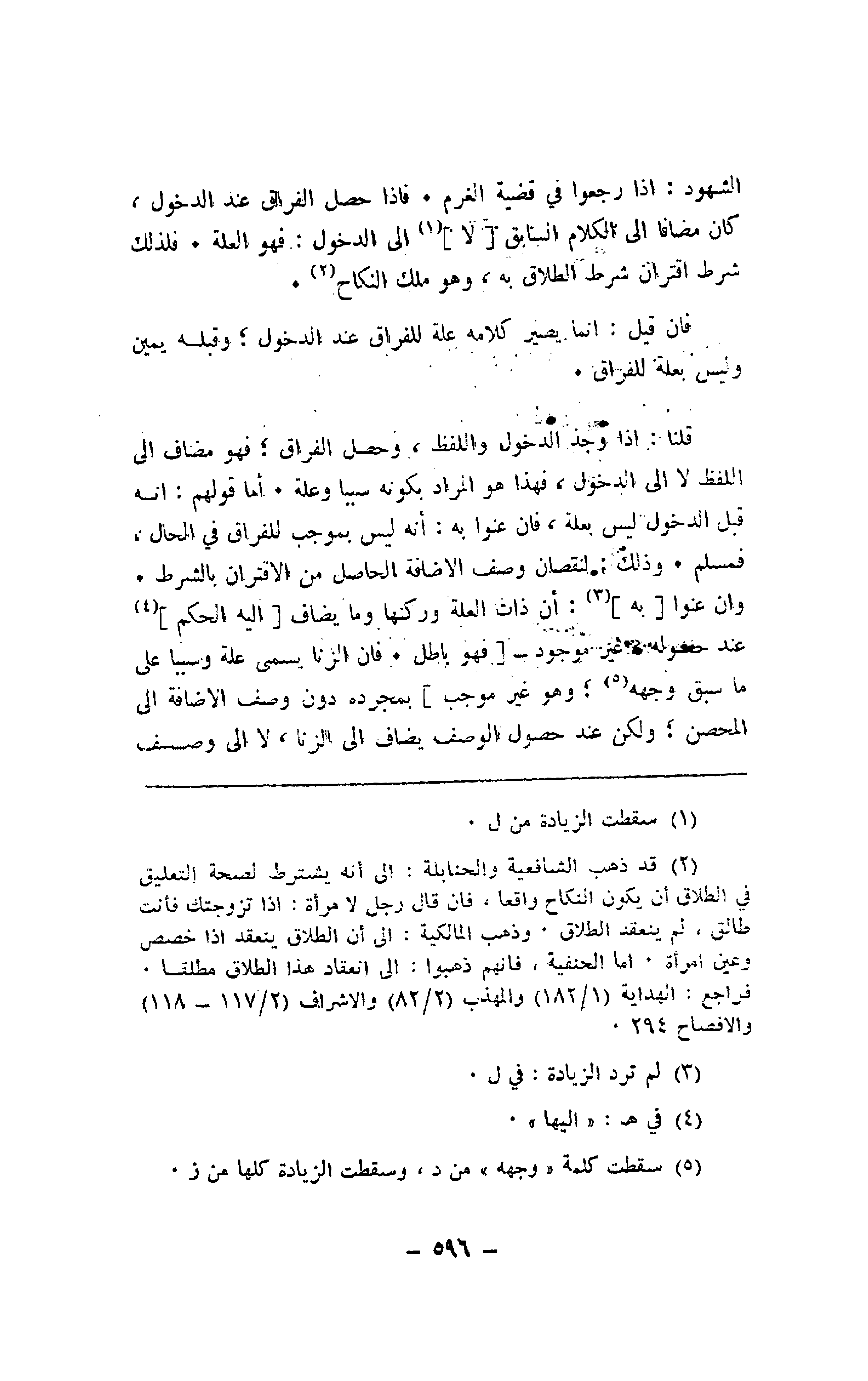 قلنا: إذا وجد الدخول واللفظ، وحصل الفراق؛ فهو مضاف إلى اللفظ لا إلى الدخول، فهذا هو المراد بكونه سببًا وعلة. أما قولهم: إنه قبل الدخول ليس بعلة، فإن عنوا به: أنه ليس بموجب للفراق في الحال، فمسلم. وذلك: لنقصان وصف الإضافة الحاصل من الاقتران بالشرط. وأن عنوا [به]: أن ذات العلة وركنها وما يضاف [إليه الحكم] عند حصوله غير موجود -[فهو باطل. فإن الزنا يسمى علة وسببًا على ما سبق وجهه؛ وهو غير موجب] بمجرده دون وصف الإضافة إلى المحصن؛ ولكن عند حصول الوصف يضاف إلى الزنا، لا إلى وصف
