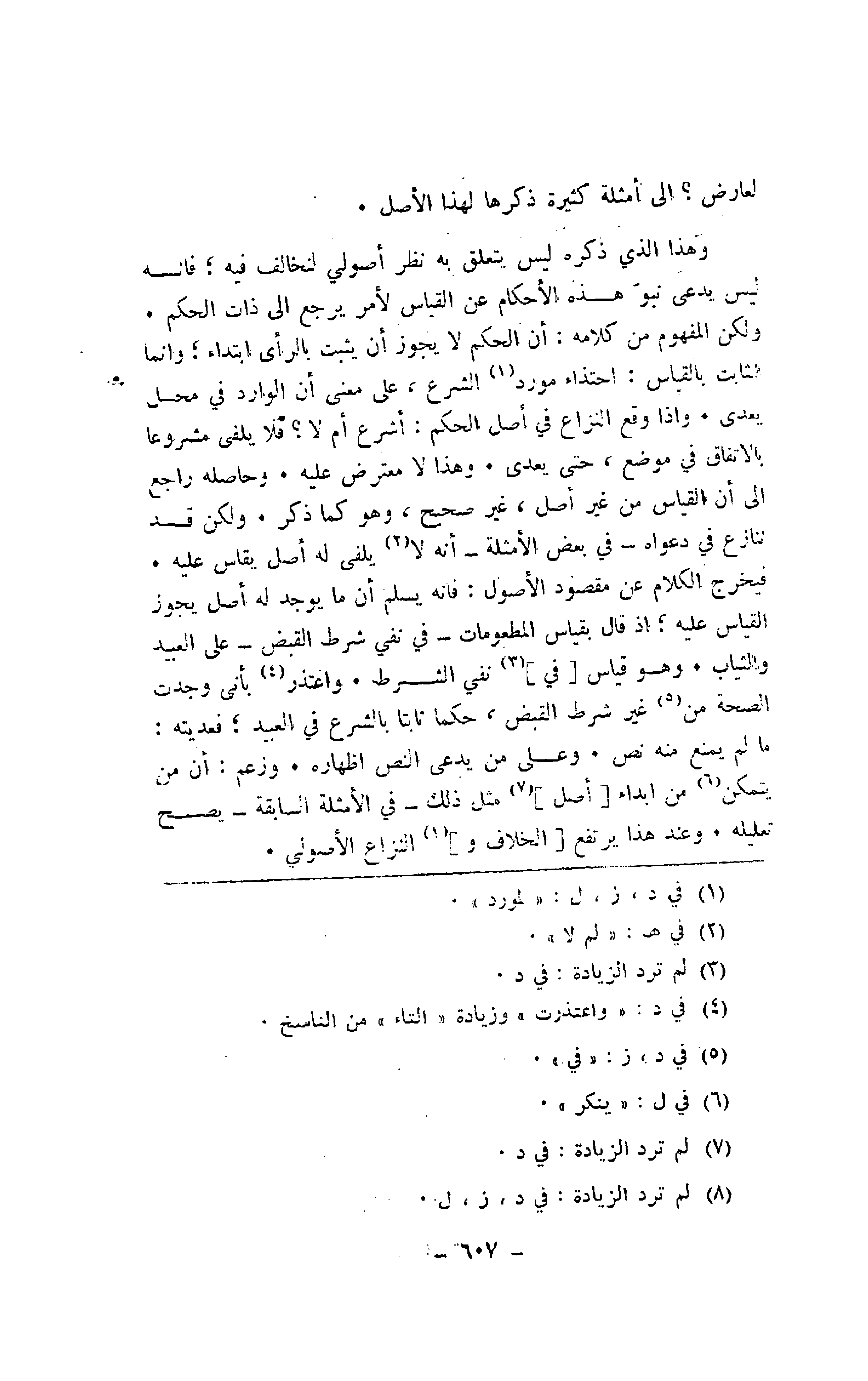 وهذا الذي ذكره ليس يتعلق به نظر أصولي لنخالف فيه؛ فإنه ليس يدعي نبو هذه الأحكام عن القياس لأمر يرجع إلى ذات الحكم. ولكن المفهوم من كلامه: أن الحكم لا يجوز أن يثبت بالرأي ابتداء؛ وإنما الثابت بالقياس: احتذاء مورد الشرع، على معنى أن الوارد في محل يعدى. وإذا وقع النزاع في أصل الحكم: أشرع أم لا؟ فلا يلفى مشروعًا بالاتفاق في موضع، حتى يعدى. وهذا لا معترض عليه. وحاصله راجع إلى أن القياس من غير أصل، غير صحيح، وهو كما ذكر. ولكن قد ننازع في دعواه -في بعض الأمثلة- أنه لا يلفى له أصل يقاس عليه. فيخرج الكلام عن مقصود الأصول: فإنه يسلم أن ما يوجد له أصل يجوز القياس عليه؛ إذا قال بقياس المطعومات -في نفي شرط القبض- على العبيد والثياب. وهو قياس [في] نفي الشرط. واعتذر بأني وجدت الصحة من غير شرط القبض، حكمًا ثابتًا بالشرع في العبيد؛ فعديته: ما لم يمنع منه نص. وعلى من يدعي النص إظهاره. وزعم: أن من يتمكن من إبداء [أصل] مثل ذلك -في الأمثلة السابقة- يصح تعليله. وعند هذا يرتفع [الخلاف و] النزاع الأصولي.
