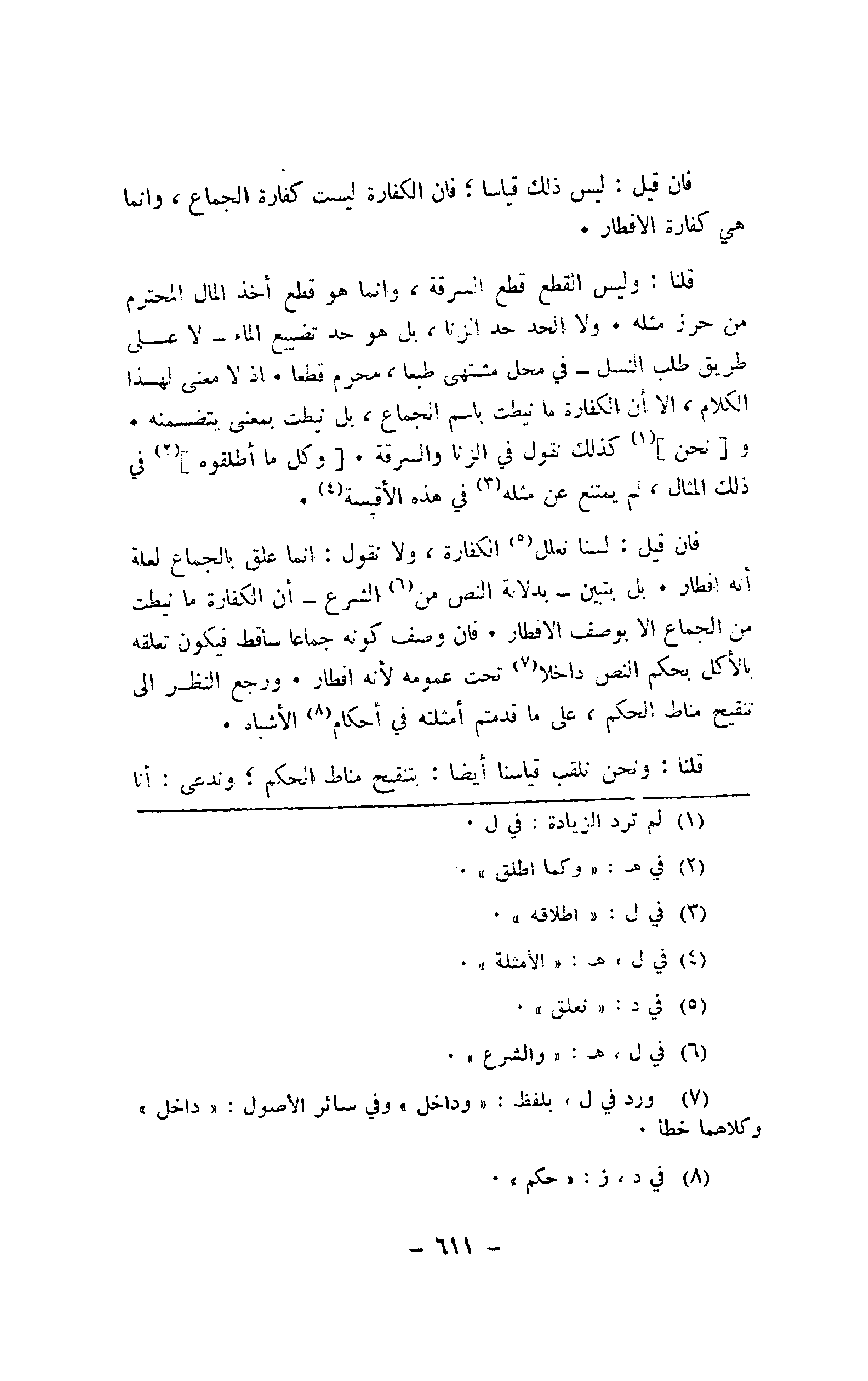 قلنا: وليس القطع قطع السرقة، وإنما هو قطع أخذ المال المحترم من حرز مثله. ولا الحد حد الزنا، بل هو حد تضييع الماء- لا على طريق طلب النسل- في محل مشتهي طبعًا، محرم قطعًا. إذ لا معنى لهذا الكلام، إلا أن الكفارة ما نيطت باسم الجماع، بل نيطت بمعنى يتضمنه. و [نحن] كذلك نقول في الزنا والسرقة. [وكل ما أطلقوه] في ذلك المثال، لم يمتنع عن مثله في هذه الأقيسة.