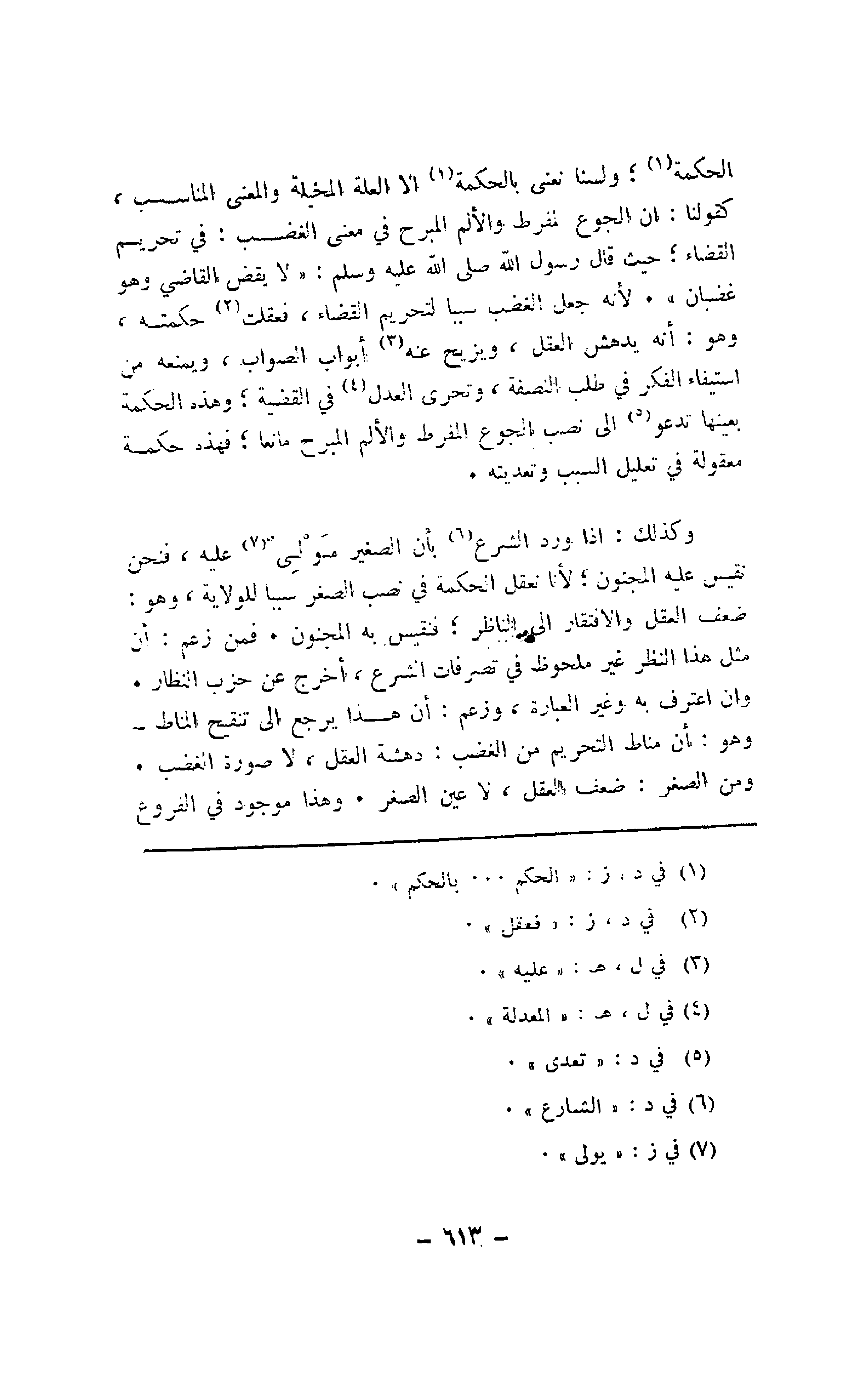الحكمة؛ ولسنا نعني بالحكمة إلا العلة المخيلة والمعنى المناسب، كقولنا: إن الجوع لمفرط والألم المبرح في معنى الغضب: في تحريم القضاء؛ حيث قال رسول الله صلى الله عليه وسلم: "لا يقض القاضي وهو غضبان". لأنه جعل الغضب سببًا لتحريم القضاء، فعقلت حكمته، هو: أنه يدهش العقل، ويزيح عنه أبواب الصواب، ويمنعه من استيفاء الفكر في طلب النصفة، وتحري العدل في القضية؛ وهذه الحكمة بعينها تدعو إلى نصب الجوع المفرط والألم المبرح مانعًا؛ فهذه حكمة معقولة في تعليل السبب وتعديته.