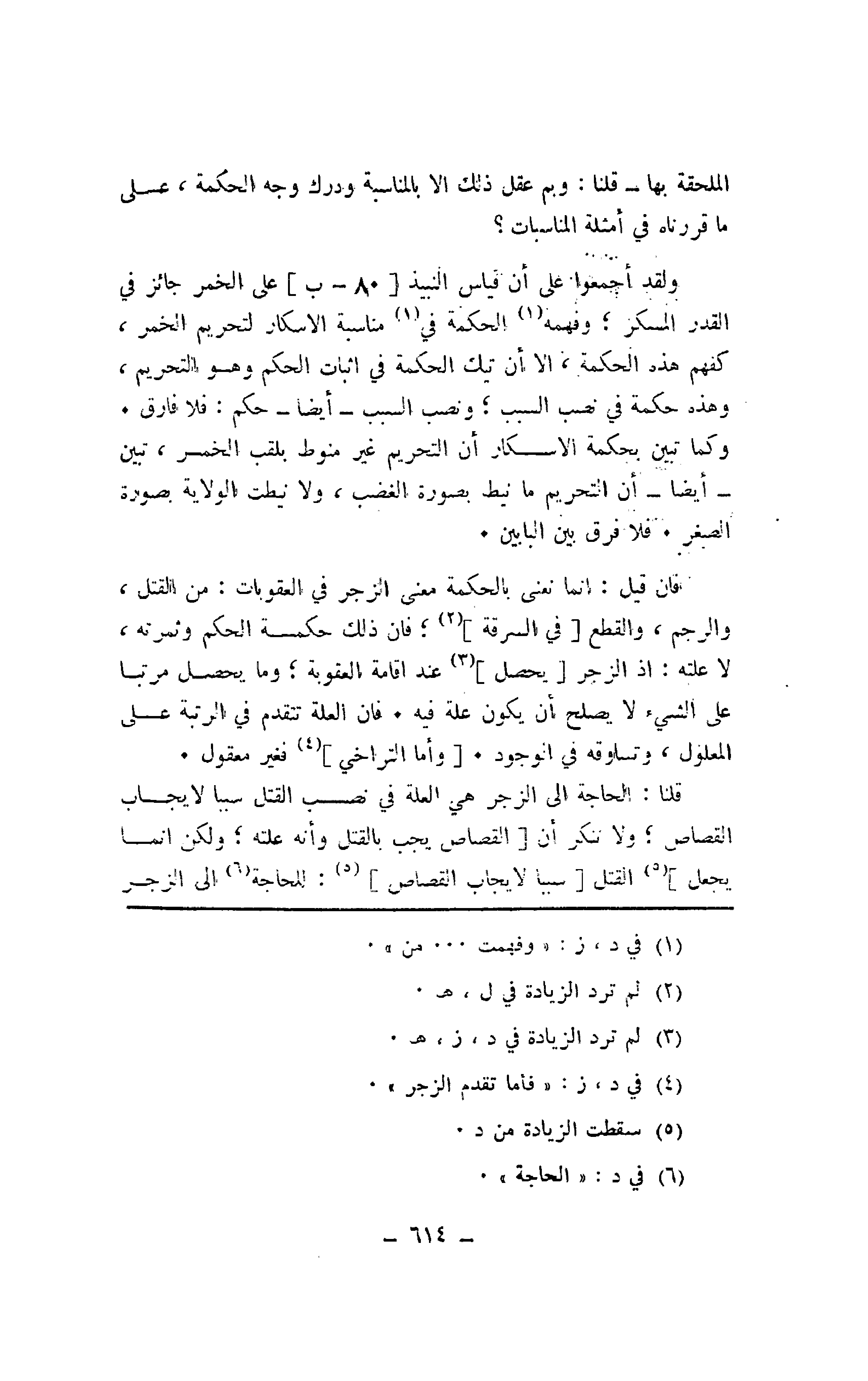 فإن قيل: إنما نعني بالحكمة معنى الزجر في العقوبات: من القتل، والرجم، والقطع [في السرقة]؛ فإن ذلك حمكة الحكم وثمرته، لا عليته: إذ الزجر [يحصل] عند إقامة العقوبة؛ وما يحصل مرتبًا على الشيء لا يصلح أن يكون علة فيه. فإن العلة تتقدم في الرتبة على المعلول، وتسلوقه في الوجود. [وأما التراخي] فغير معقول.