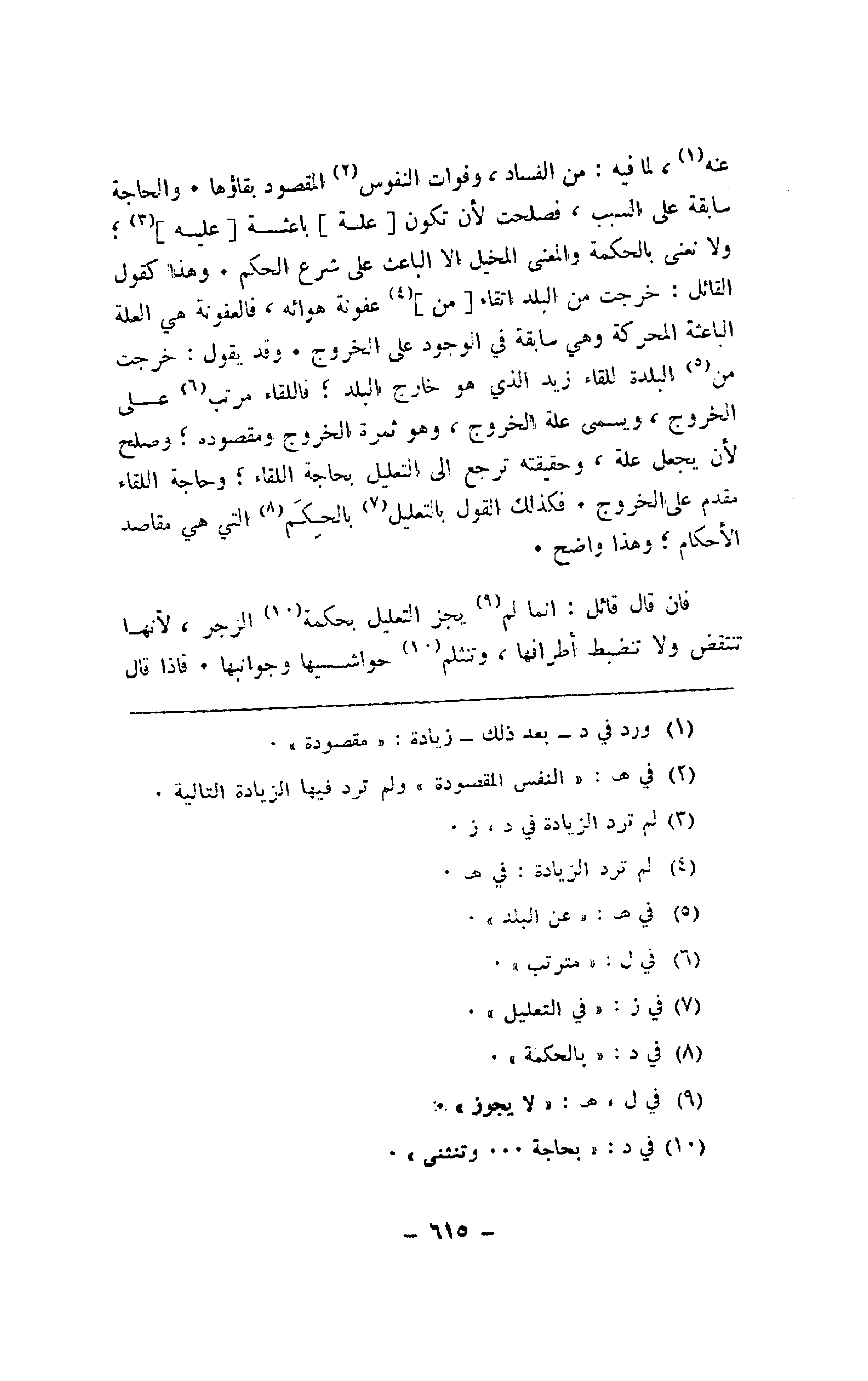 عنه، لما فيه: من الفساد، وفوات النفس المقصود بقاؤها. والحاجة سابقة على السبب، فصلحت لأن تكون [علة] باعثة [عليه]؛ ولا نعني بالحكمة والمعنى المخيل إلا الباعث على شرع الحكم. وهذا كقول القائل: خرجت من البلد اتقاء [من] عفونة هوائه، فالعفونة هي العلة الباعثة المحركة وهي سابقة في الوجود على الخروج. وقد يقول: خرجت من البلدة للقاء زيد الذي هو خارج البلد؛ فاللقاء مرتب على الخروج، ويسمى علة الخروج، وهو ثمرة الخروج ومقصوده؛ وصلح لأن يجعل علة، وحقيقته ترجع إلى التعليل بحاجة اللقاء؛ وحاجة اللقاء مقدم على الخروج. فكذلك القول بالتعليل بالحكم التي هي مقاصد الأحكام؛ وهذا واضح.