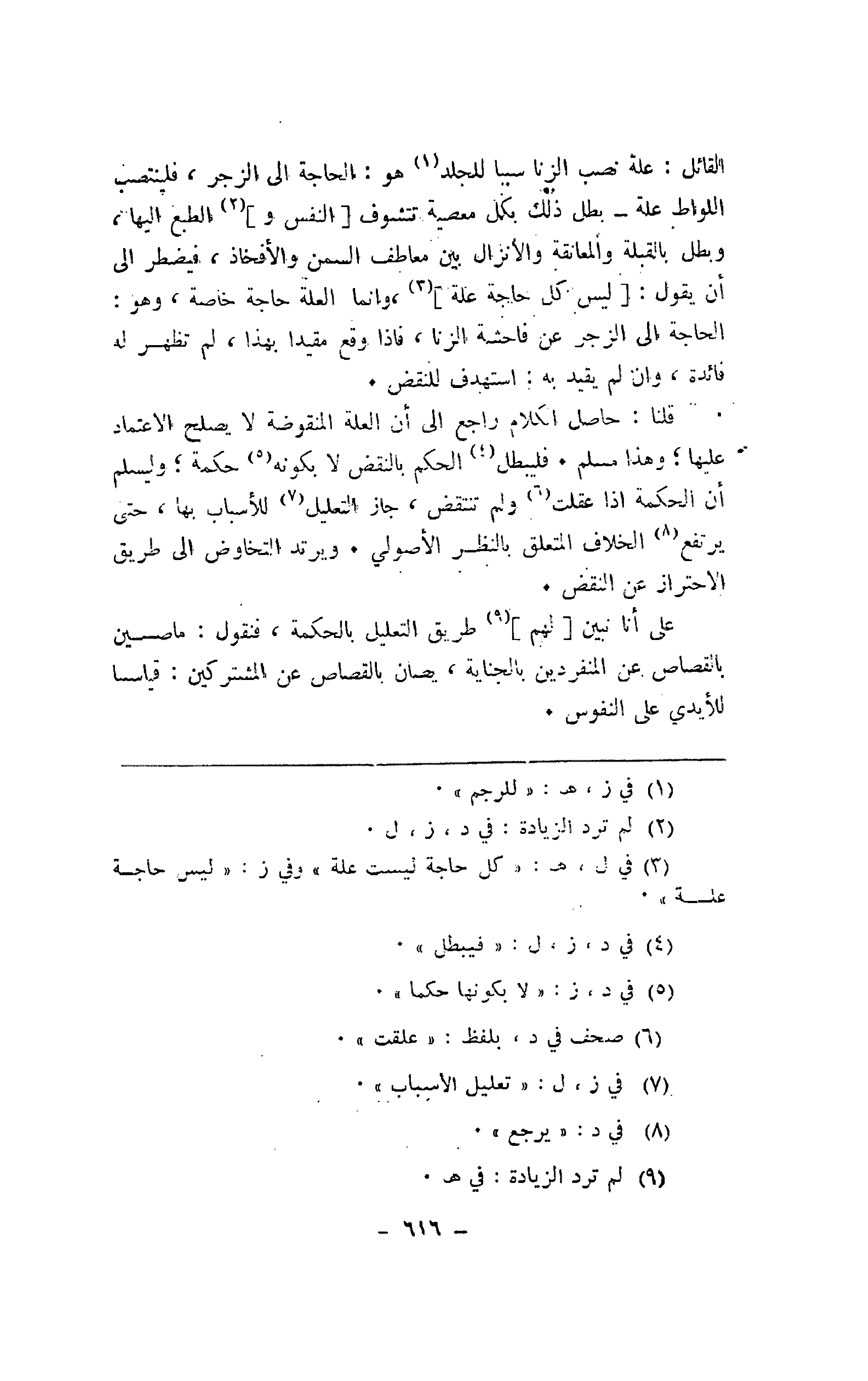 القائل: علة نصب الزنا سببًا للجلد هو: الحاجة إلى الزجر، فلينتصب اللواط علة -بطل ذلك بكل معصية تتشوف [النفس و] الطبع إليها، وبطل بالقبلة والمعانقة والأنزال بين معاطف السمن والأفخاذ، فيضطر إلى أن يقول: [ليس كل حاجة علة]، وإنما العلة حاجة خاصة، وهو: الحاجة إلى الزجر عن فاحشة الزنا، فإذا وقع مقيدًا بهذا، لم تظهر له فائدة، وإن لم يقيد به: استهدف للنقض.
