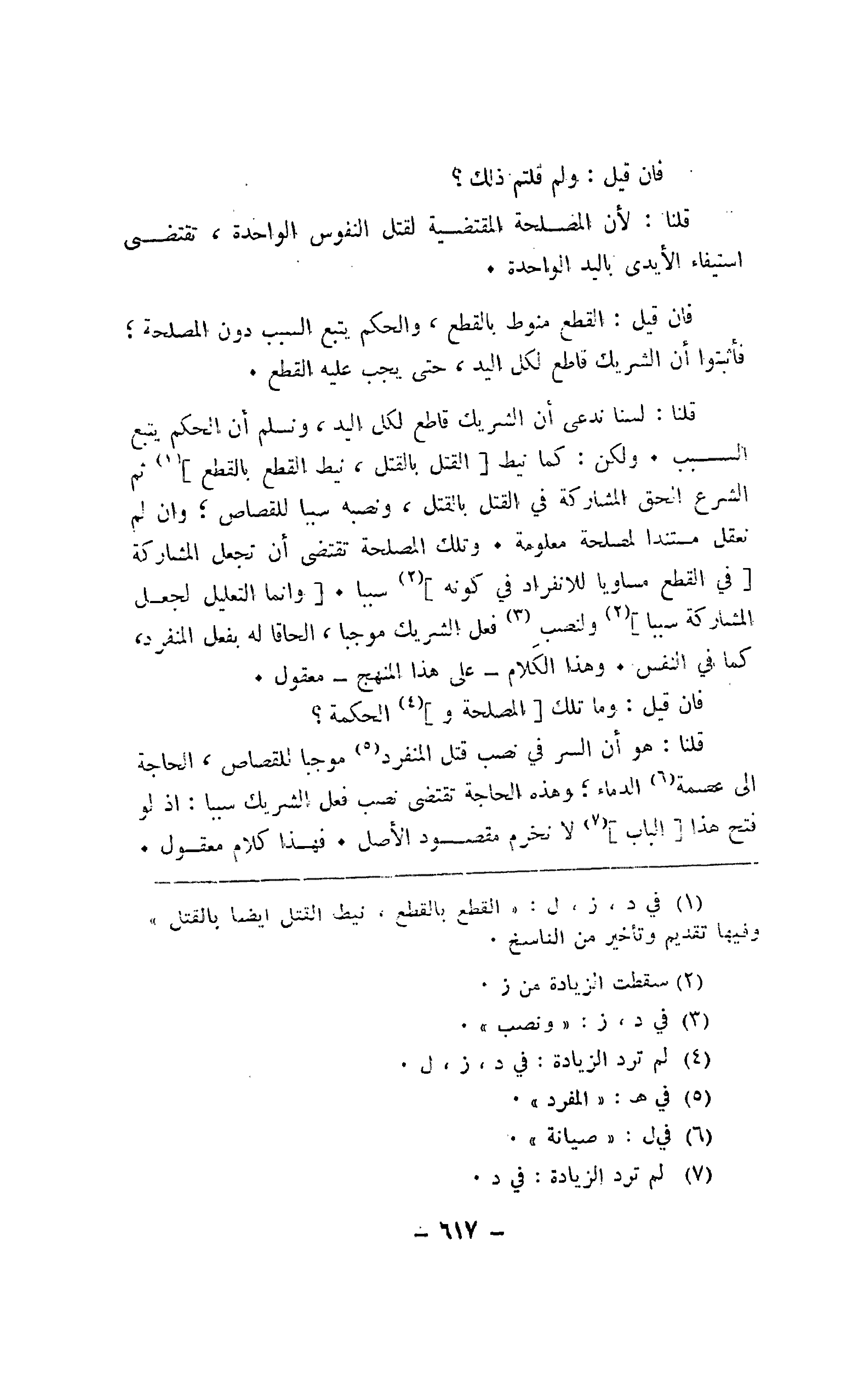 قلنا: لسنا ندعي أن الشريك قاطع لكل اليد، ونسلم أن الحكم يتبع السبب. ولكن: كما نيط [القتل بالقتل، نيط القطع بالقطع] ثم الشرع الحق المشاركة في القتل بالقتل، ونصبه سببًا للقصاص؛ وإن لم نعقل مستندًا لمصلحة معلومة. وتلك المصلحة تقتضي أن تجعل المشاركة [في القطع مساويًا للانفراد في كونه] سببًا. [وإنما التعليل لجعل المشاركة سببًا] ولنصب فعل الشريك موجبًا، إلحاقًا له بفعل المنفرد، كما في النفس. وهذا الكلام -على هذا المنهج- معقول.