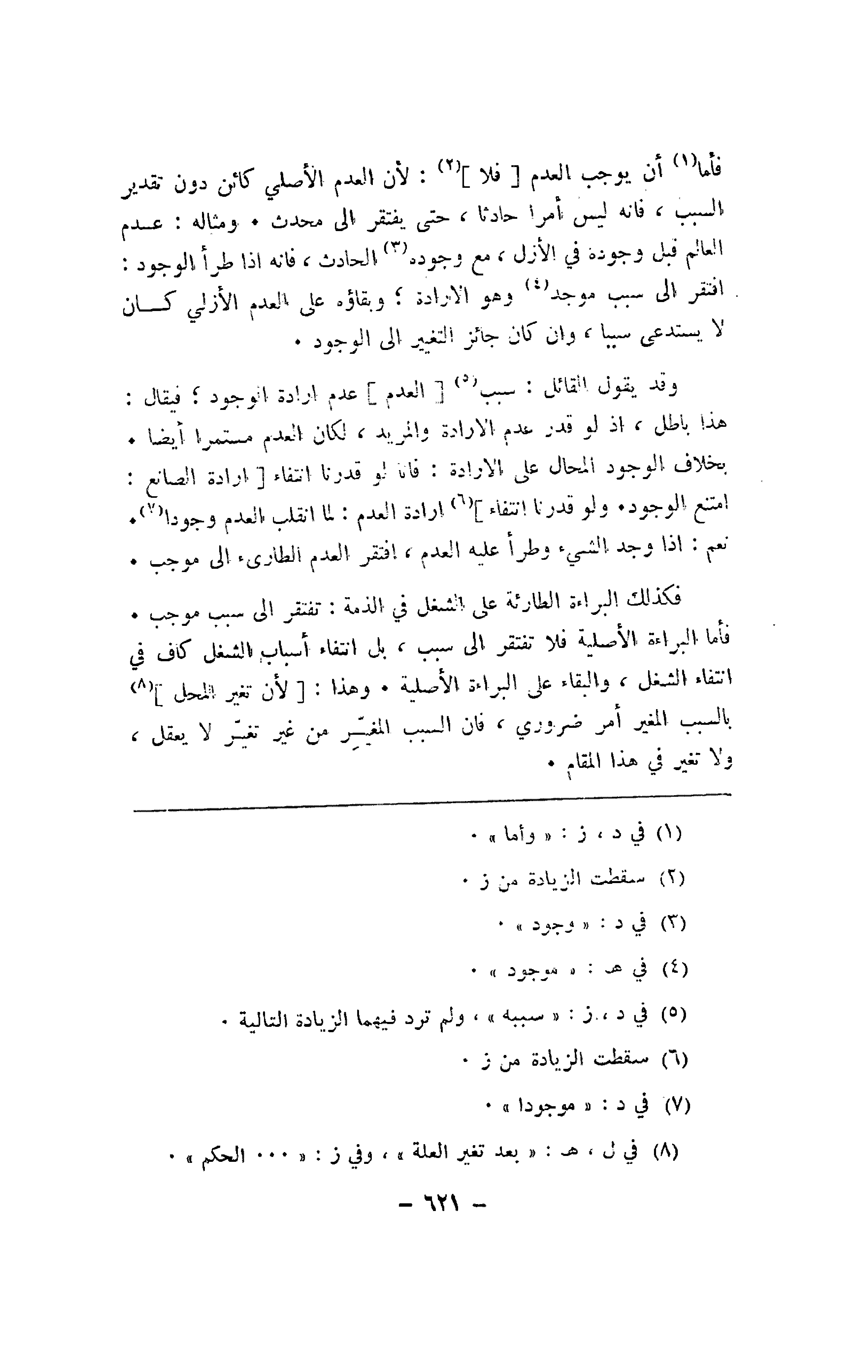 فأما أن يوجب العدم [فلا]: لأن العدم الأصلي كائن دون تقدير السبب، فإنه ليس أمرًا حادثًا، حتى يفتقر إلى محدث. ومثاله: عدم العالم قبل وجوده في الأزل، مع وجوده الحادث، فإنه إذا طرأ الوجود: افتقر إلى سبب موجد وهو الإرادة؛ وبقاؤه على العدم الأزلي كان لا يستدعي سببًا، وإن كان جائز التغيير إلى الوجود.