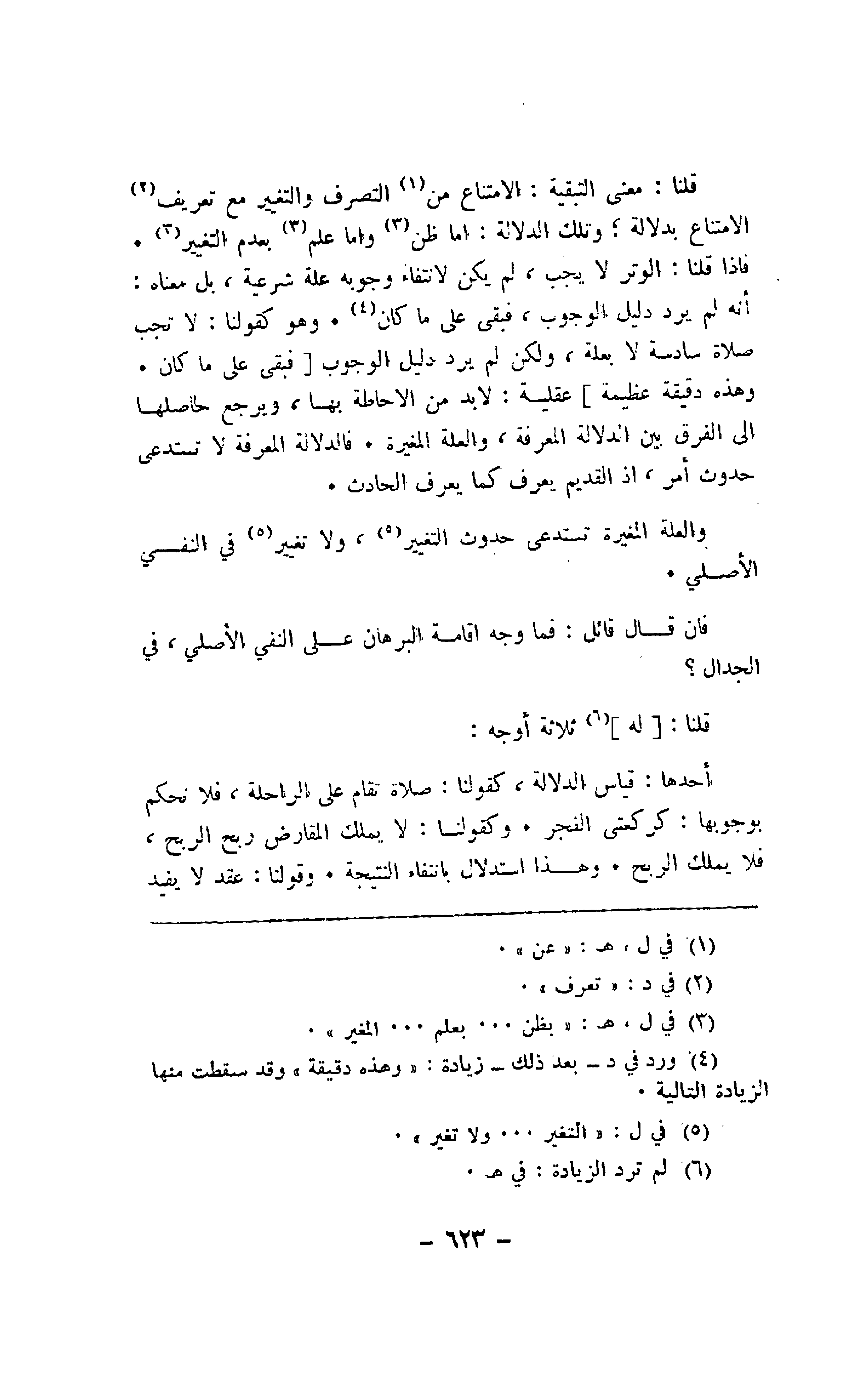 قلنا: معنى التبقية: الامتناع من التصرف والتغير مع تعري الامتناع بدلالة؛ وتلك الدلالة: إما ظن وإما علم بعدم التغيير. فإذا قلنا: الوتر لا يجب، لم يكن لانتفاء وجوبه علة شرعية، بل معناه: أنه لم يرد دليل الوجوب، فبقى على ما كان. وهو كقولنا: لا تجب صلاة سادسة لا بعلة، ولكن لم يرد دليل الوجوب [فبقى على ما كان. وهذه دقيقة عظيمة] عقلية: لابد من الإحاطة بها، ويرجع لحاصلها إلى الفرق بين الدلالة المعرفة، والعلة المغيرة. فالدلالة المعرفة لا تستدعي حدوث أمر، إذ القديم يعرف كما يعرف الحادث.