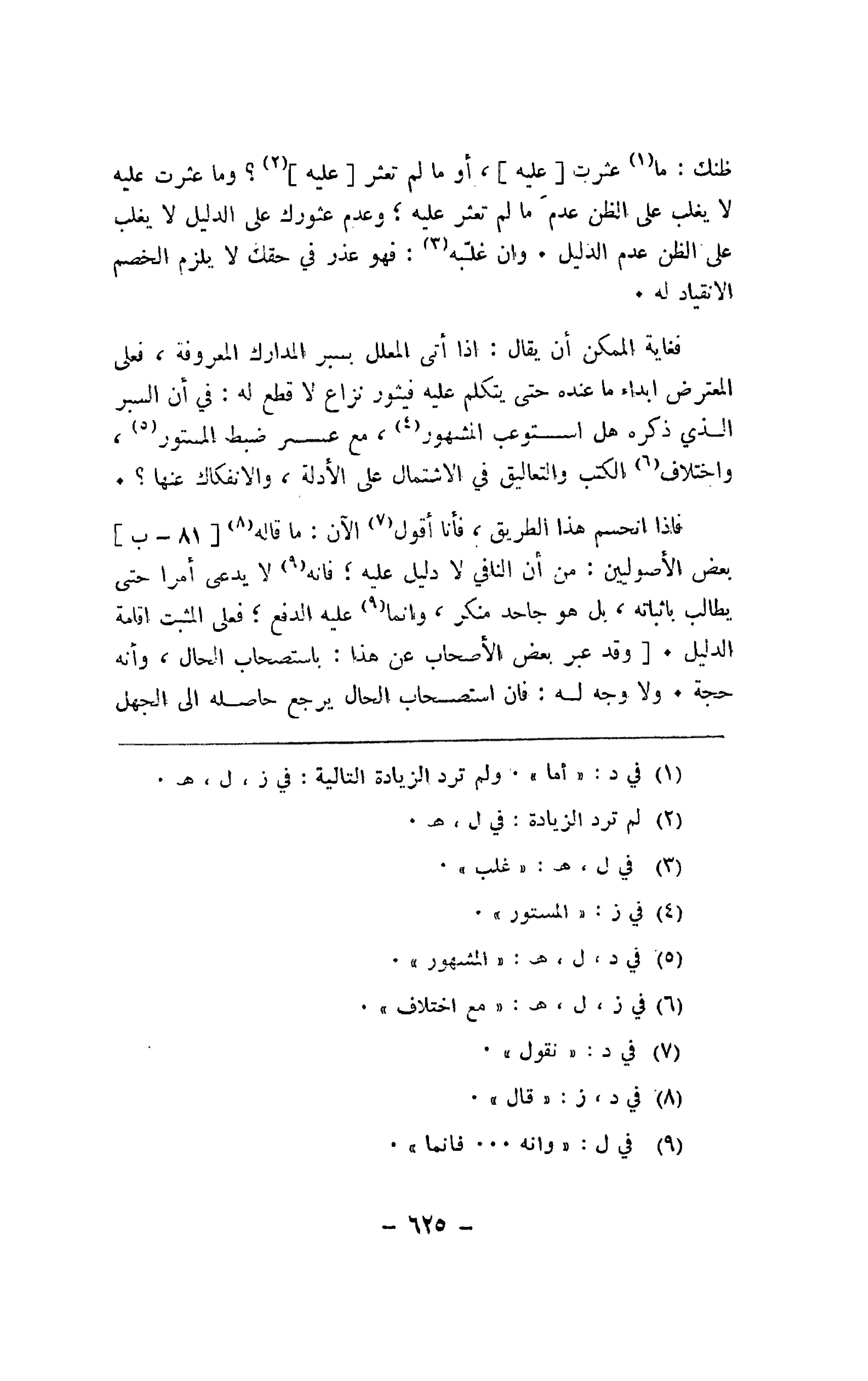 ظنك: ما عثرت [عليه]، أو ما لم تعثر [عليه]؟ وما عثرت عليه لا يغلب على الظن عدم ما لم تعثر عليه؛ وعدم عثورك على الدليل لا يغلب على الظن عدم الدليل. وإن غلبه: فهو عذر في حقك لا يلزم الخصم الانقياد له.