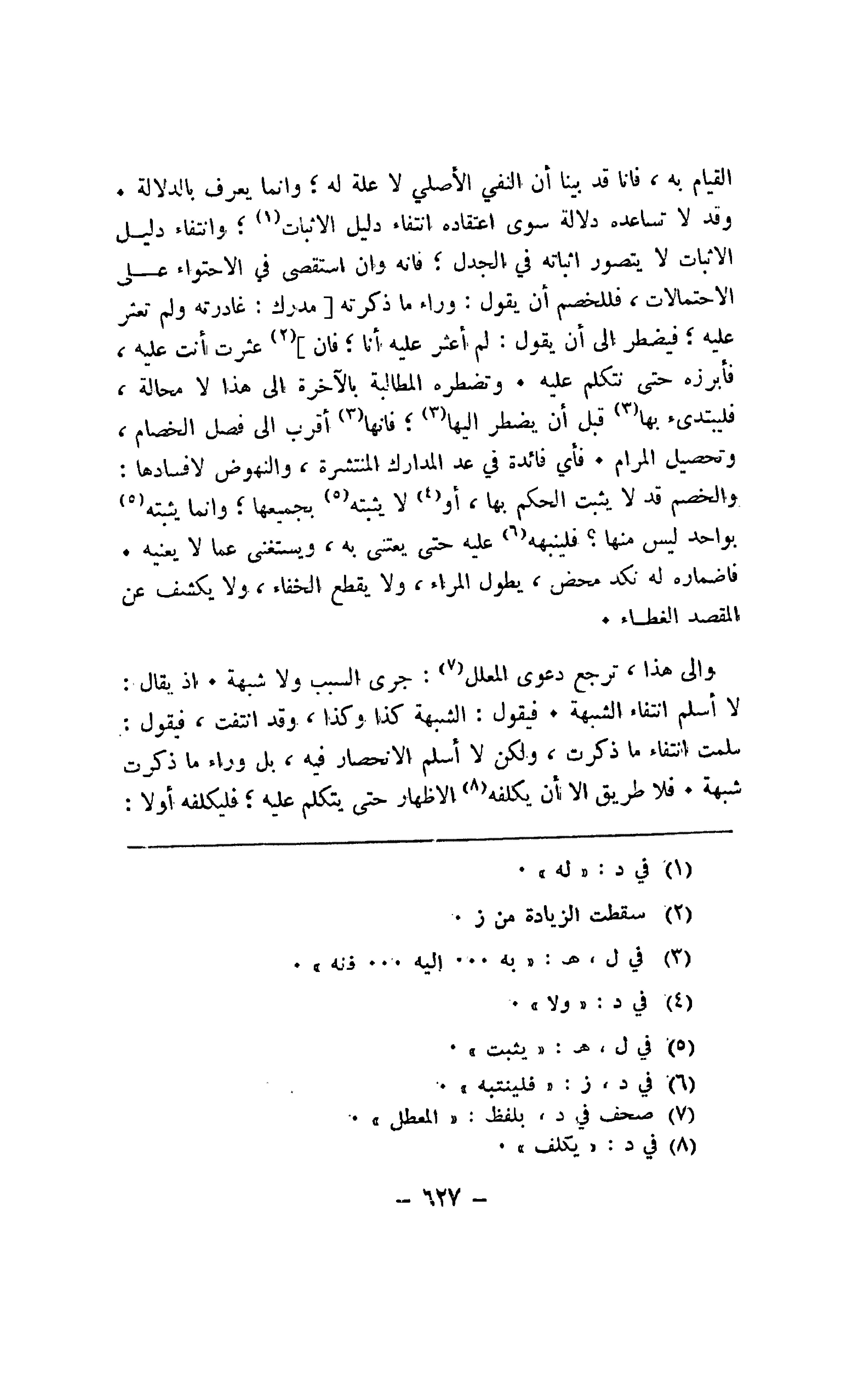 القيام به، فأنا قد بينا أن النفي الأصلي لا علة له؛ وإنما يعرف بالدلالة. وقد لا تساعده دلالة سوى اعتقاده انتفاء دليل الإثبات؛ وانتفاء دليل الإثبات لا يتصور إثباته في الجدل؛ فإنه وإن استقصى في الاحتواء على الاحتمالات، فللخصم أن يقول: وراء ما ذكرته [مدرك: غادرته ولم تعثر عليه؛ فيضطر إلى أن يقول: لم أعثر عليه أنا؛ فان] عثرت أنت عليه، فأبرزه حتى نتكلم عليه. وتضطره المطالبة بالآخرة إلى هذا لا محالة، فليبتدئ بها قبل أن يضطر إليها؛ فإنها أقرب إلى فصل الخصام، وتحصيل المرام. فأي فائدة في عد المدارك المنتشرة، والنهوض لإفسادها: والخصم قد لا يثبت الحكم بها، أو لا يثبته بجميعها؛ وإنما يثبته بواحد ليس منها؟ فلينبهه عليه حتى يعتني به، ويتسغني عما لا يعنيه. فاضماره له نكد محض، يطول المراء، ولا يقطع الخفاء، ولا يكشف عن المقصد الغطاء.