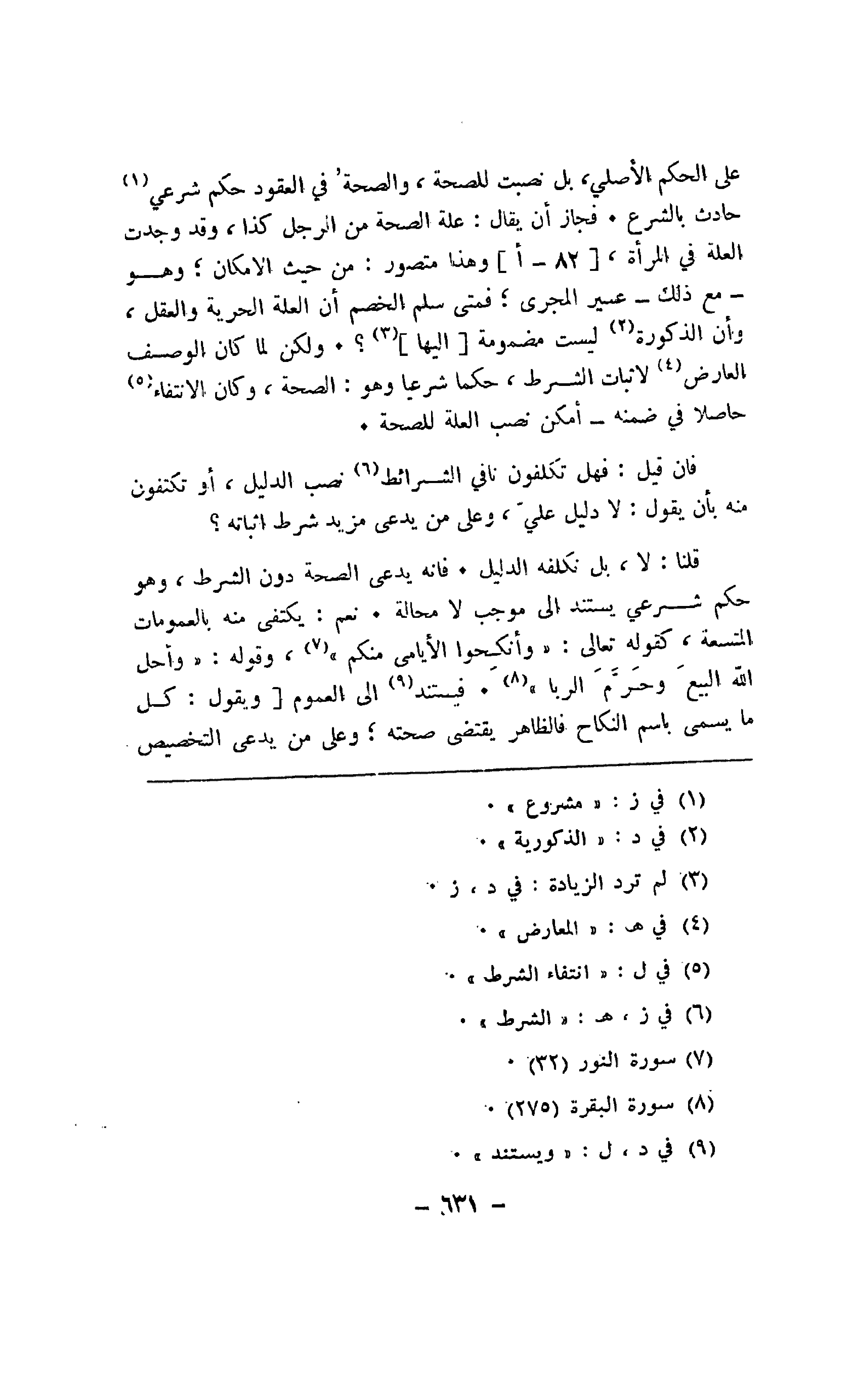 على الحكم الأصلي، بل نصبت للصحة، والصحة في العقود حكم شرعي حادث بالشرع. فجاز أن يقال: علة الصحة من الرجل كذا، وقد وجدت العلة في المرأة، [82 - أ] وهذا متصور: من حيث الإمكان؛ وهو -مع ذلك- عسير المجرى؛ فمتى سلم الخصم أن العلة الحرية والعقل، وأن الذكورة ليست مضمونة [إليها]؟. ولكن لما كان الوصف العارض لإثبات الشرط، حكمًا شرعيًا وهو: الصحة، وكان الانتفاء حاصلاً في ضمنه -أمكن نصب العلة للصحة.