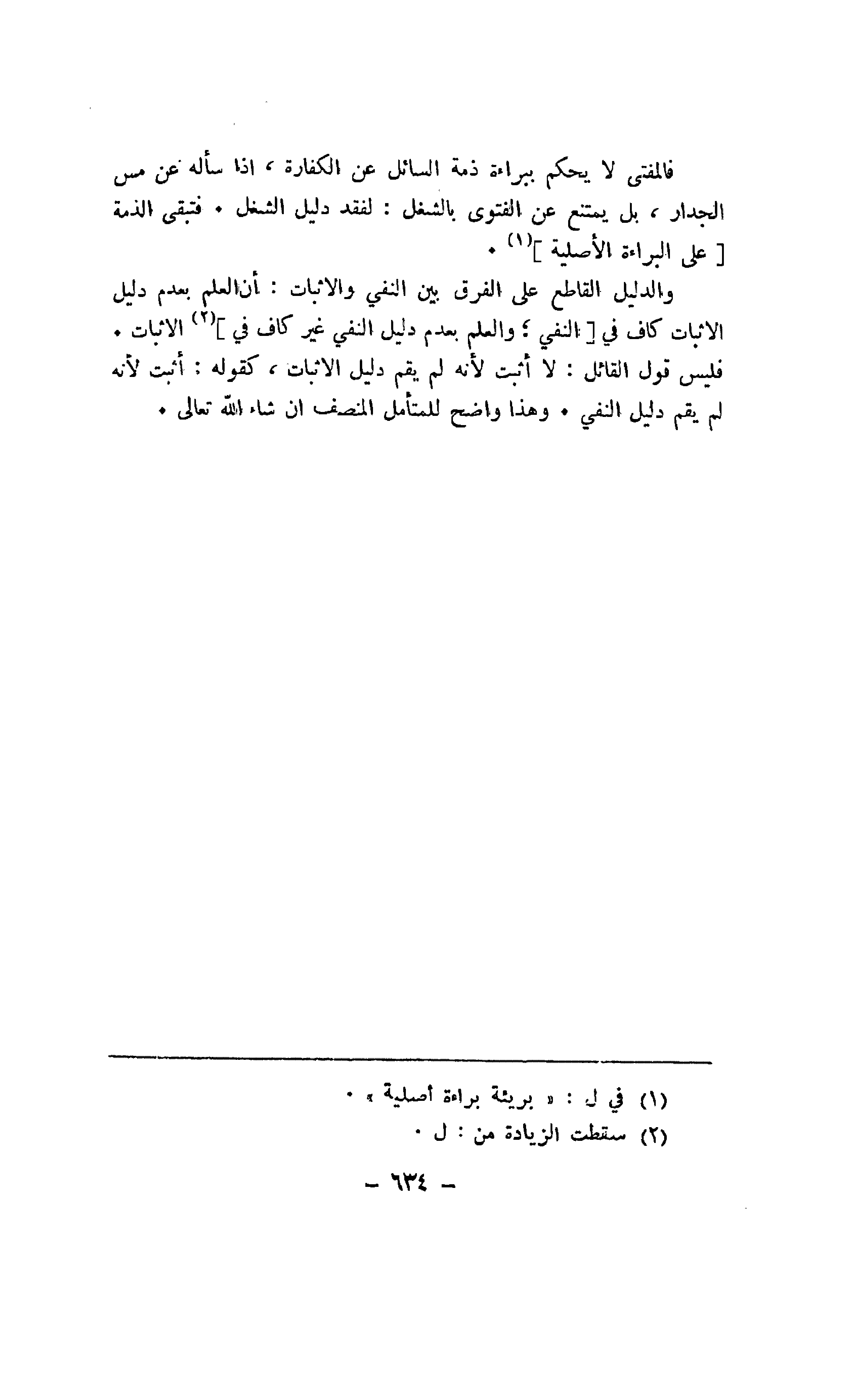 فالمفتي لا يحكم ببراءة ذمة السائل عن الكفارة، إذا سأله عن مس الجدار، بل يمتنع عن الفتوى بالشغل: لفقد دليل الشغل. فتبقى الذمة [على البراءة الأصلية].