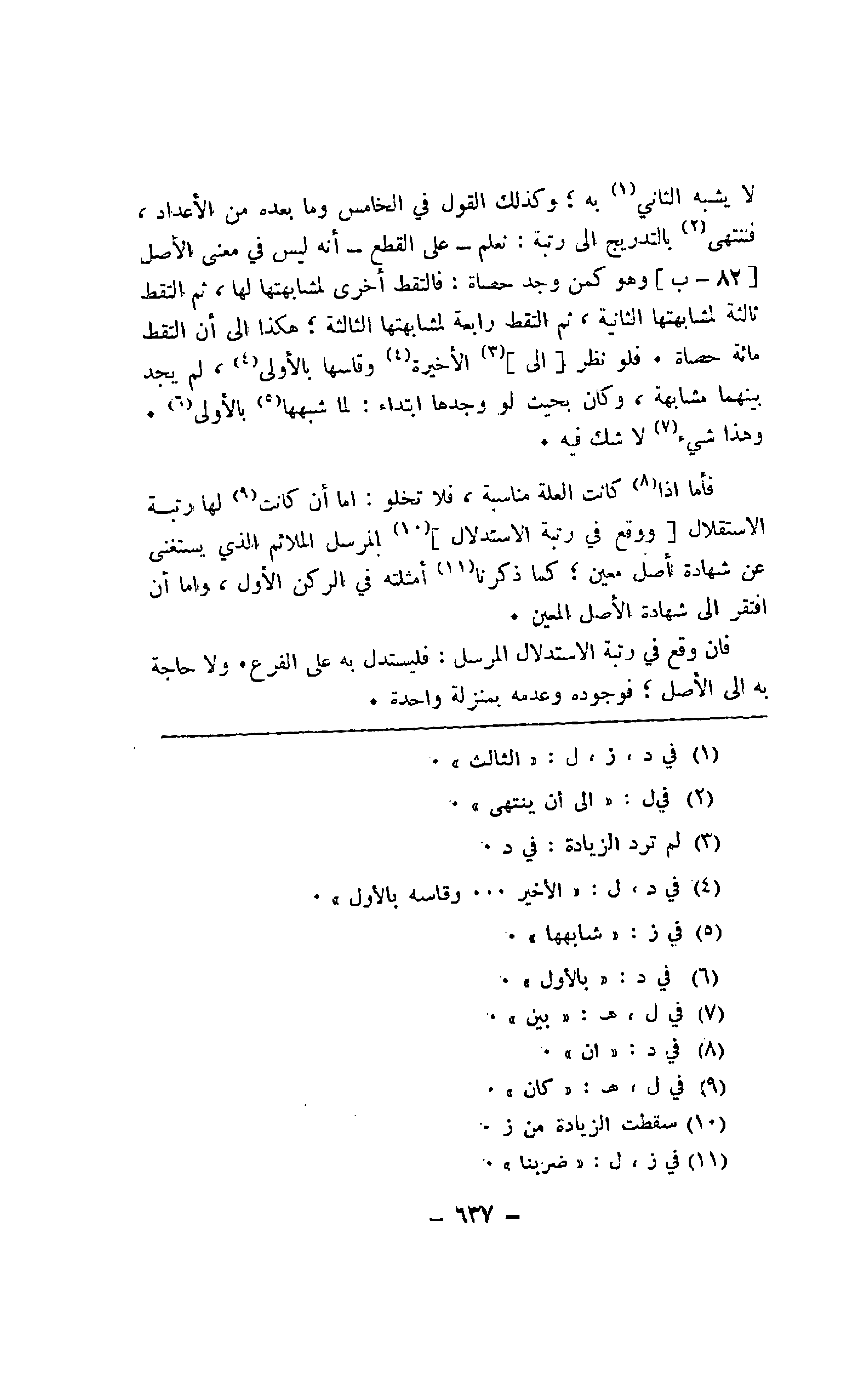 لا يشبه الثاني به؛ وكذلك القول في الخامس وما بعده من الأعداد، فننهي بالتدريج إلى رتبة: نعلم -على القطع- أنه ليس في معنى الأصل [82 - ب] وهو كمن وجد حصاة: فالتقط أخرى لمشابهتها لها، ثم التقط ثالثة لمشابهتها الثانية، ثم التقط رابعة لمشابهتها الثالثة؛ هكذا إلى أن التقط مائة حصاة. فلو نظر [إلى] الأخيرة وقاسها بالأولى، لم يجد بينهما مشابهة، وكان بحيث لو وجدها ابتداء: لما شبهها بالأولى. وهذا شيء لا شك فيه.