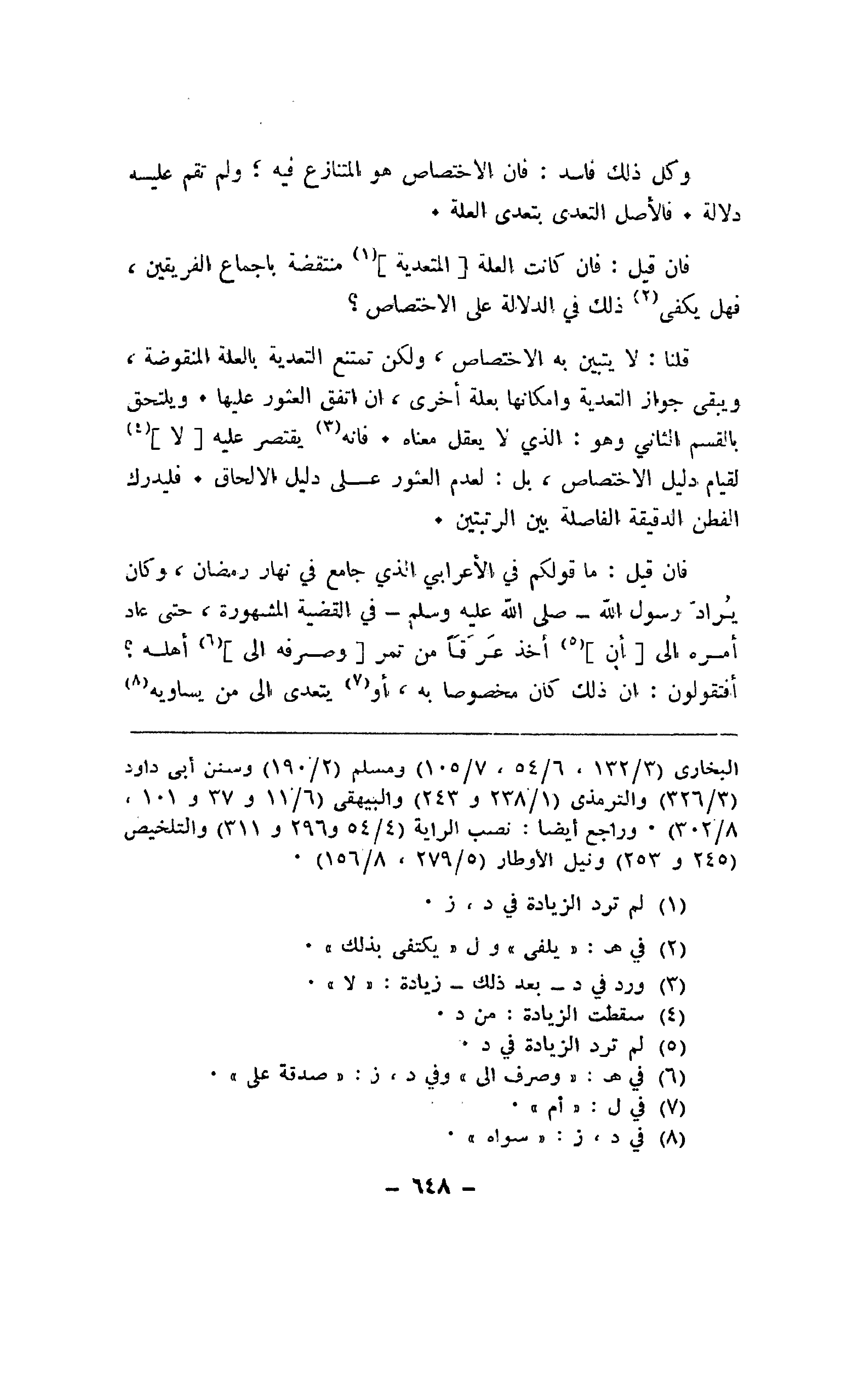 قلنا: لا يتبين به الاختصاص، ولكن تمتنع التعدية بالعلة المنقوضة، ويبقى جواز التعدية وإمكانها بعلة أخرى، أن اتفق العثور عليها. ويلتحق بالقسم الثاني وهو: الذي لا يعقل معناه. فإنه يقتصر عليه [لا] لقيام دليل الاختصاص، بل: لعدم العثور على دليل الإلحاق. فليدرك الفطن الدقيقة الفاصلة بين الرتبتين.