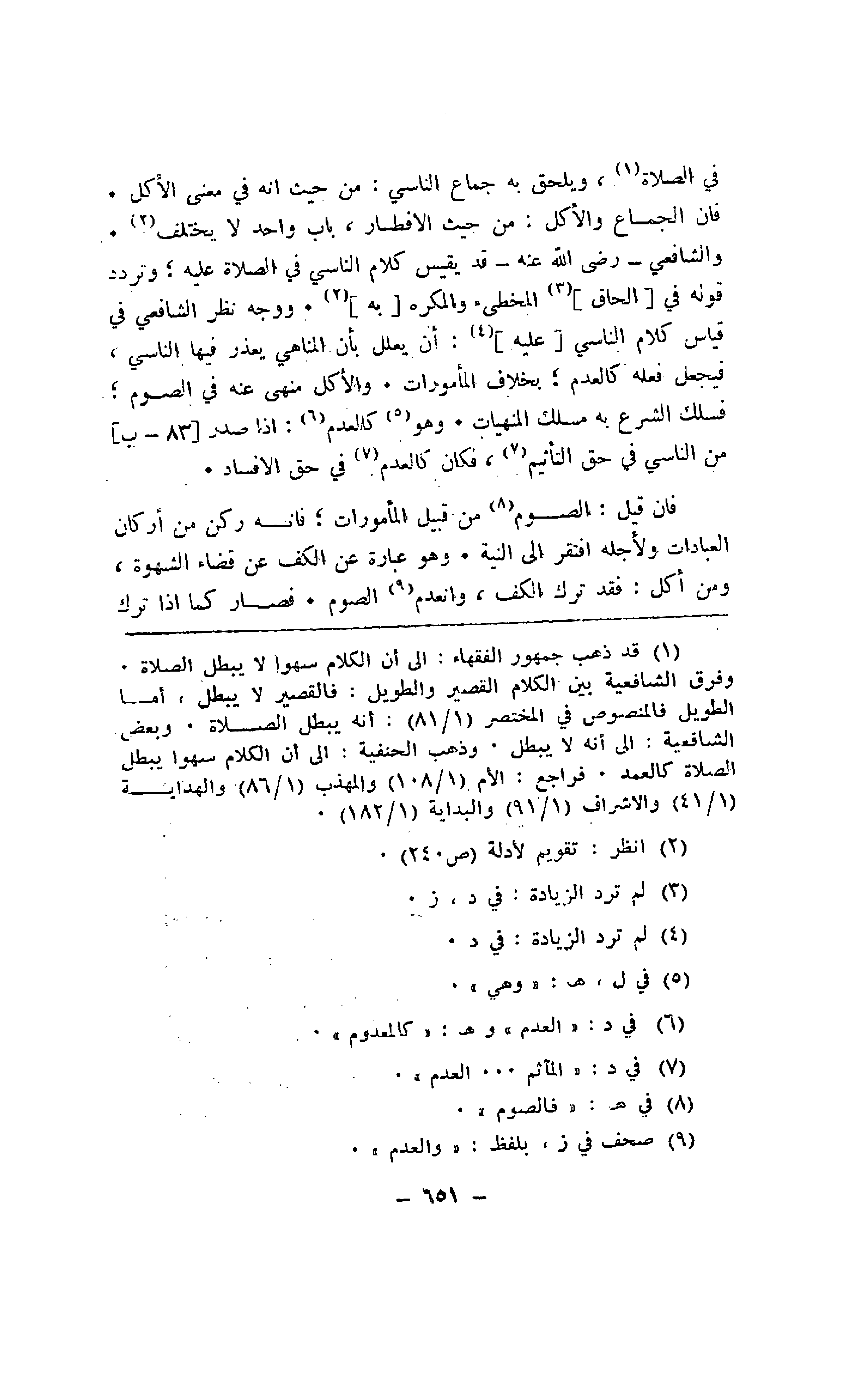 في الصلاة، ويلحق به جماع الناسي: من حيث أنه في معنى الأكل. فإن الجماع والأكل: من حيث الإفطار، باب واحد لا يختلف. والشافعي -رضي الله عنه- قد يقيس كلام الناسي في الصلاة عليه؛ وتردد قوله في [الحاق] المخطئ والمكره [به]. ووجه نظر الشافعي في قياس كلام الناسي [عليه]: أن يعلل بأن المناهي يعذر فيها الناسي، فيجعل فعله كالعدم؛ بخلاف المأمورات. والأكل منهى عنه في الصوم؛ فسلك الشرع به مسلك المنهيات. وهو كالعدم: إذا صدر [83 - ب] من الناسي في حق التأثيم، فكان كالعدم في حق الإفساد.