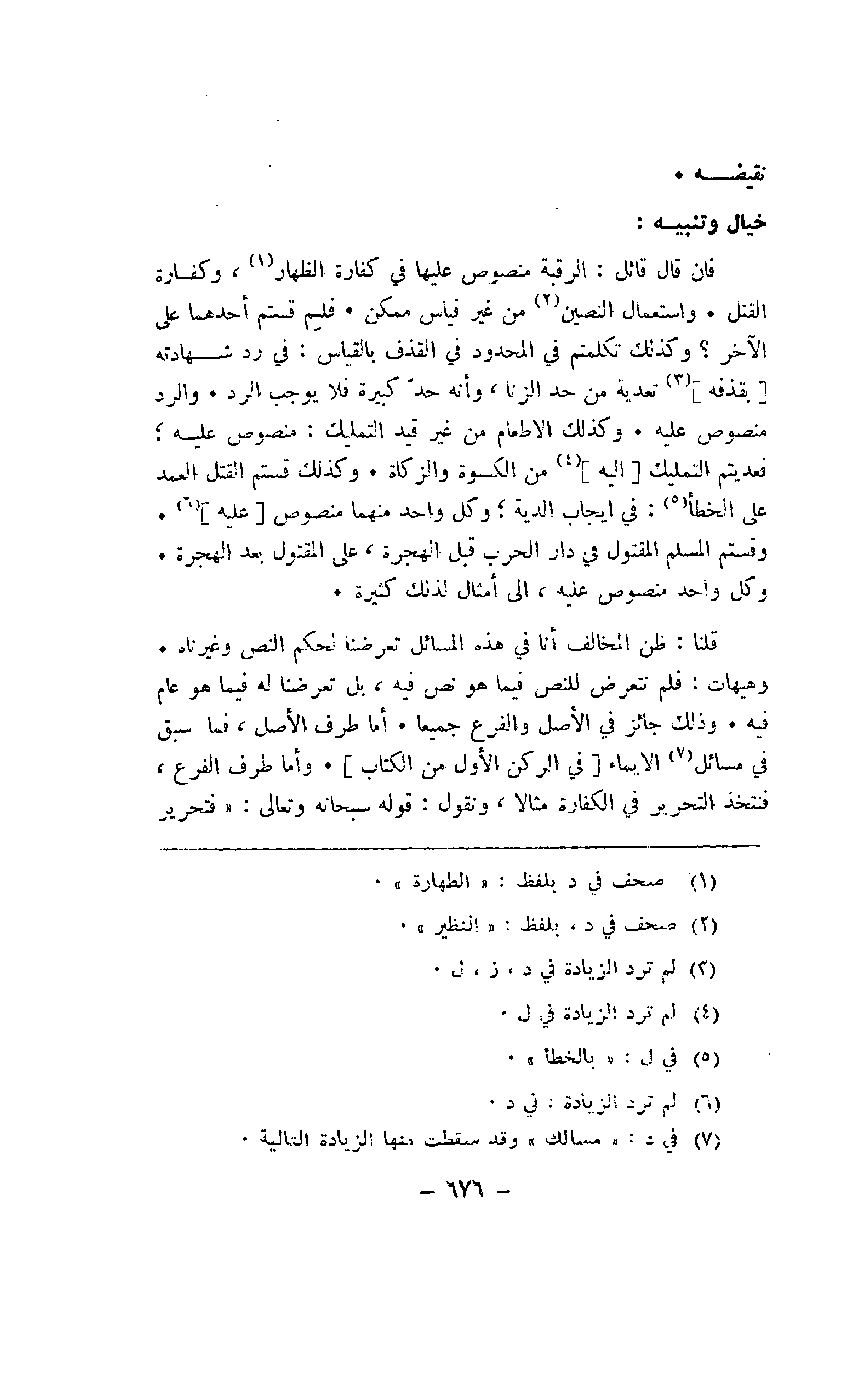 قلنا: ظن المخالف أنا في هذه المسائل تعرضنا لحكم النص وغيرناه. وهيهات: فلم نتعرض للنص فيما هو نص فيه، بل تعرضنا له فيما هو عام فيه. وذلك جائز في الأصل والفرع جميعًا. أما طرف الأصل، فما سبق في مسائل الإيماء [في الركن الأول من الكتاب]. وأما طرف الفرع، فنتخذ التحرير في الكفارة مثالًا، ونقول: قوله سبحانه وتعالى: «فتحرير