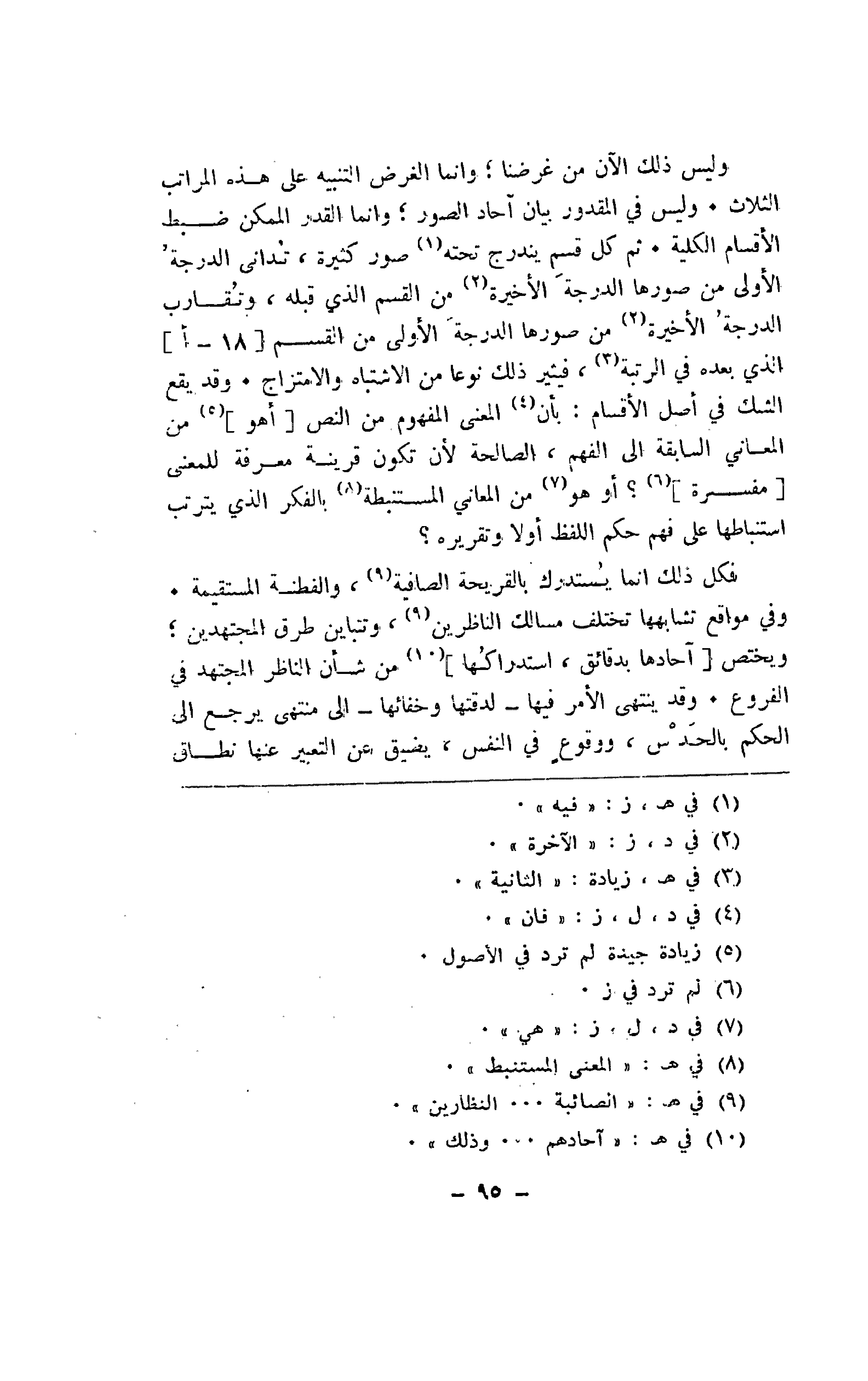 وليس ذلك الآن من غرضنا؛ وإنما الغرض التنبيه على هذه المراتب الثلاث. وليس في المقدور بيان آحاد الصور؛ وإنما القدر الممكن ضبط الأقسام الكلية. ثم كل قسم يندرج تحته صور كثيرة، تداني الدرجة الأولى من صورها الدرجة الأخيرة من القسم الذي قبله، وتقارب الدرجة الأخيرة من صورها الدرجة الأولى من القسم] 18 - أ [الذي بعده في الرتبة، فيثير ذلك نوعاً من الاشتباه والامتزاج. وقد يقع الشك في أصل الأقسام: بأن المعنى المفهوم من النص [أهو] من المعاني السابقة إلى الفهم، الصالحة لأن تكون قرينة معرفة للمعنى [مفسرة]؟ أو هو من المعاني المستنبطة بالفكر الذي يترتب استنباطها على فهم حكم اللفظ أولاً وتقريره؟
